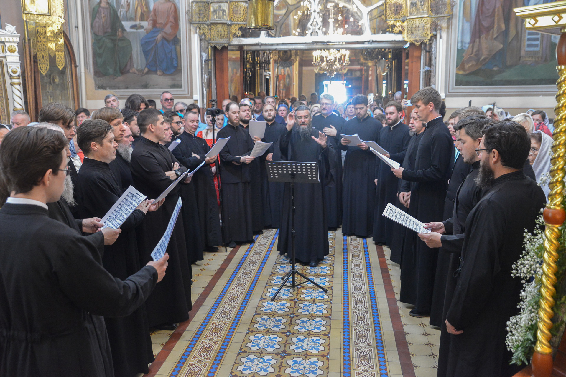 Богослужебные песнопения исполнил братский хор Свято-Троицкой Сергиевой Лавры под управлением иеродиакона Михея (Сорре).