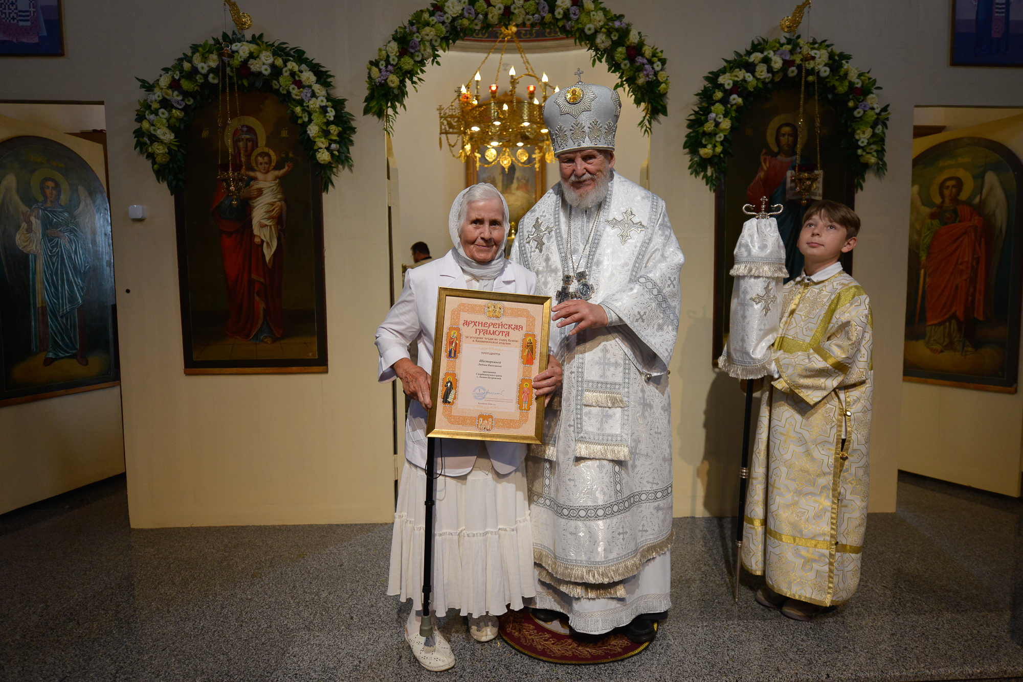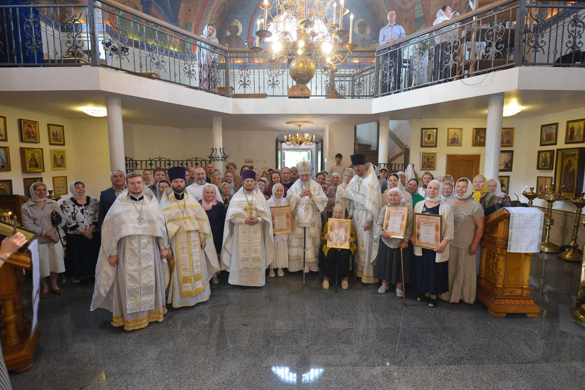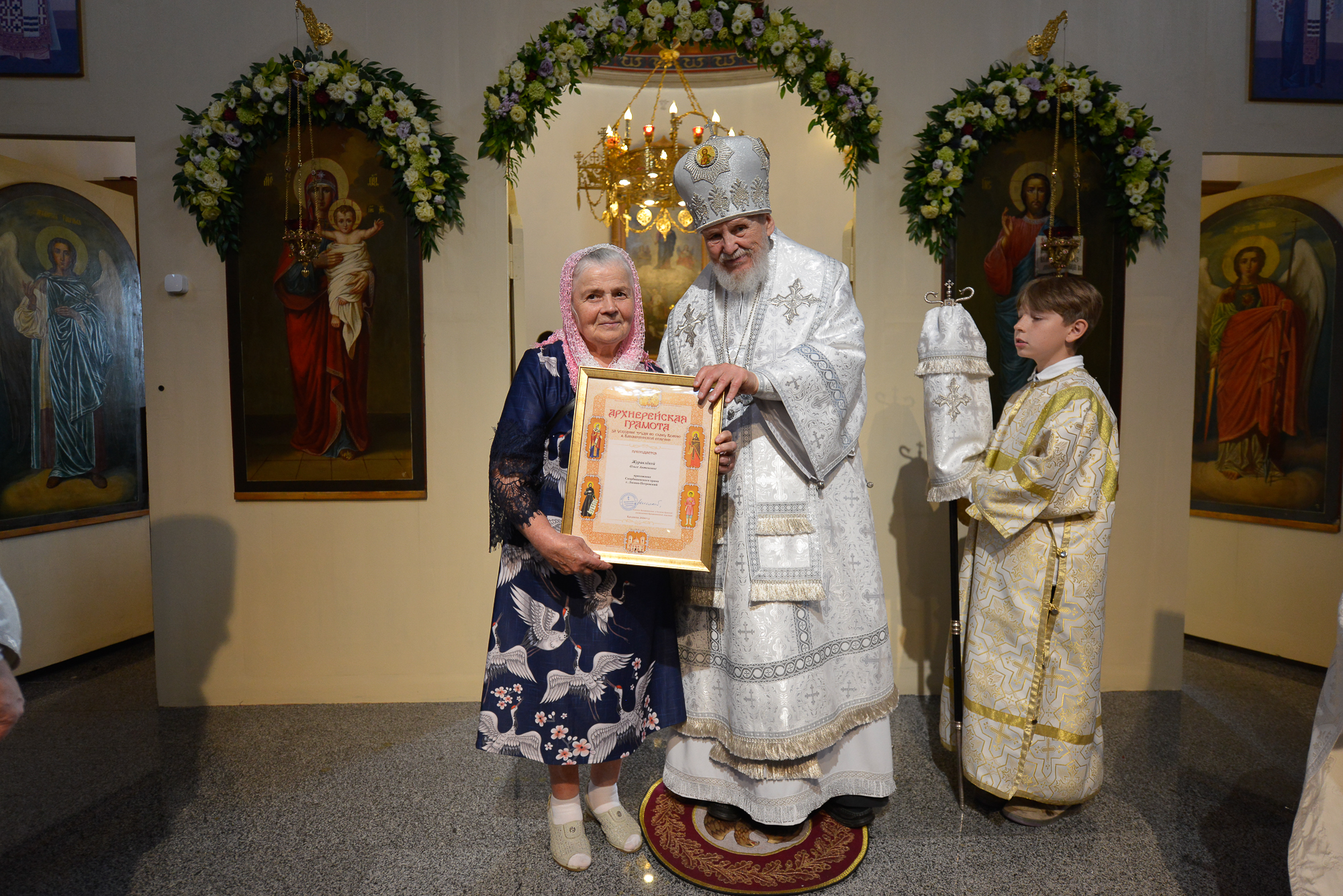 Затем Его Преосвященство обратился к сослужившему духовенству и молящимся с архипастырским словом, после чего вручил Архиерейские грамоты Балашихинской епархии сотрудникам, благоукрасителям и благотворителям храма.