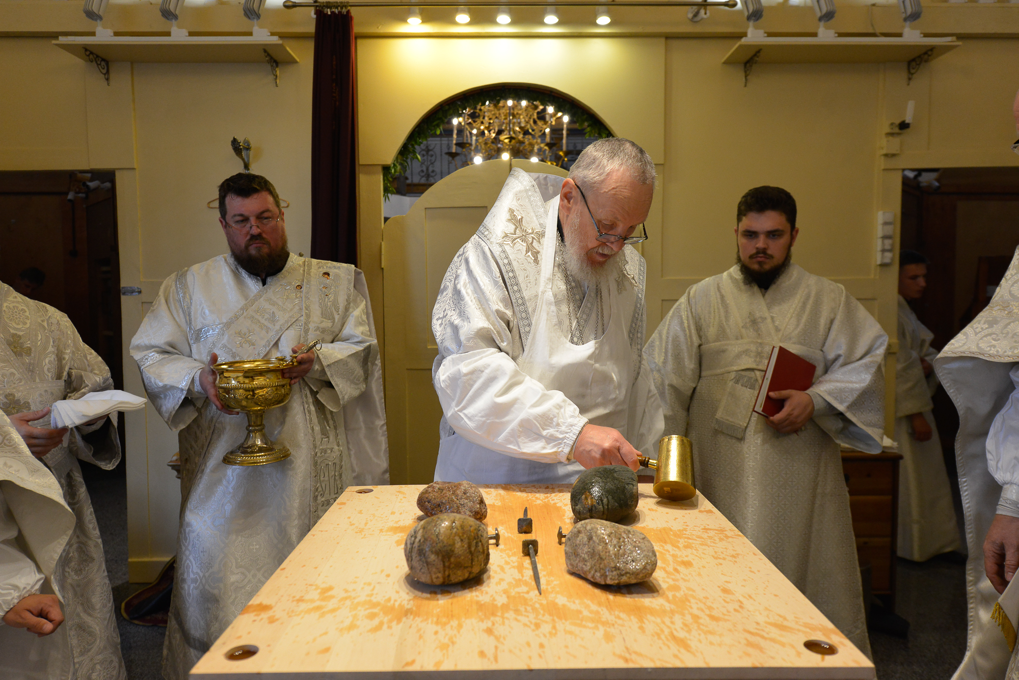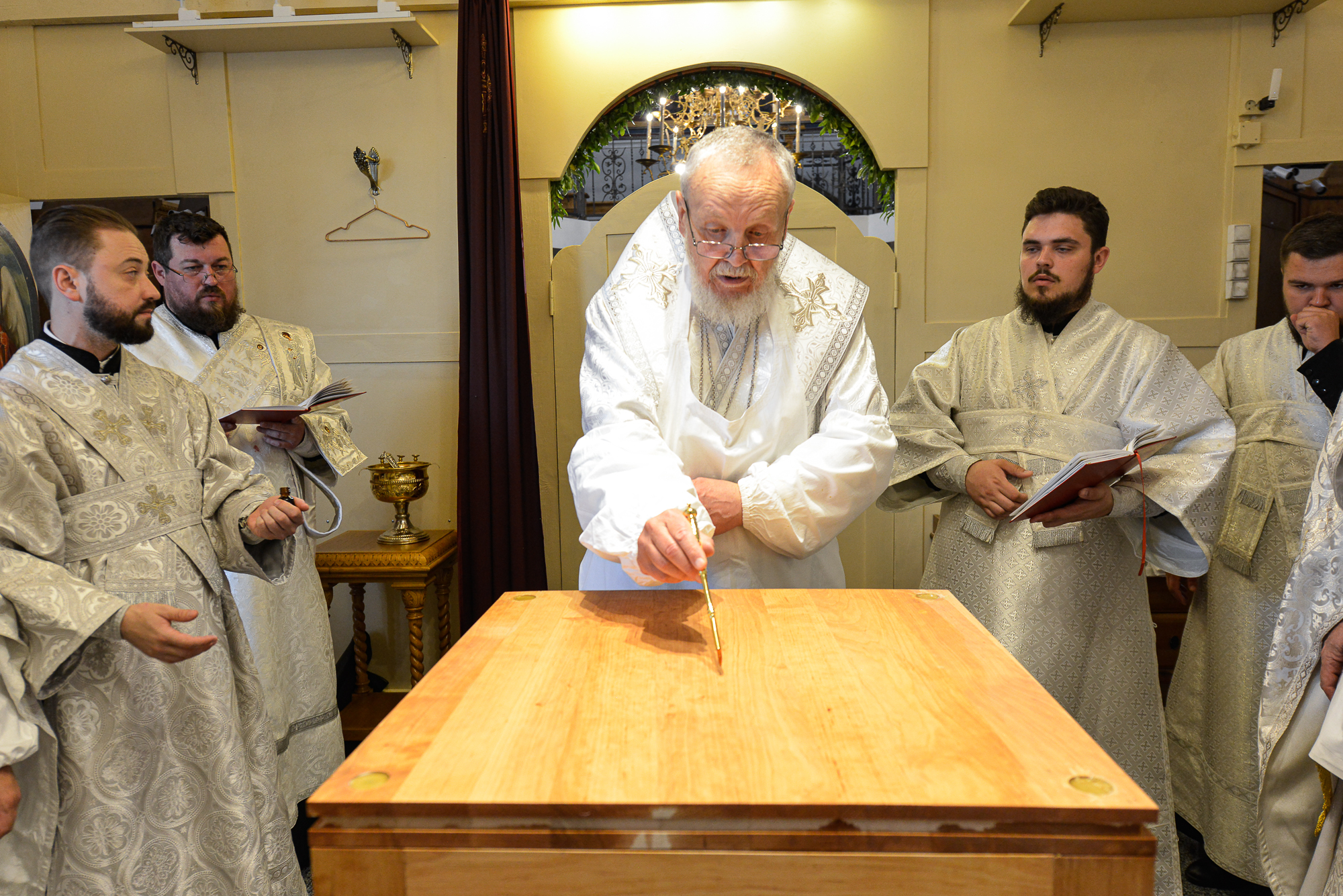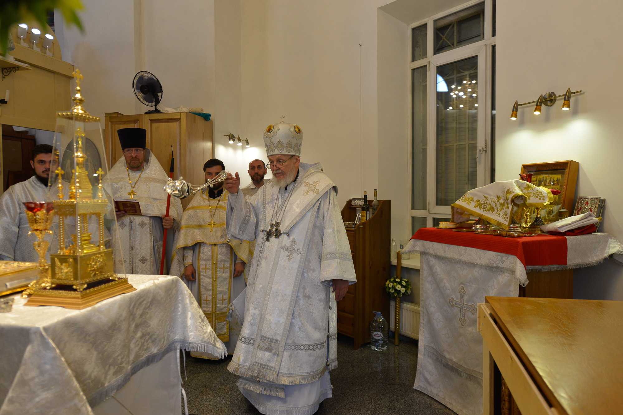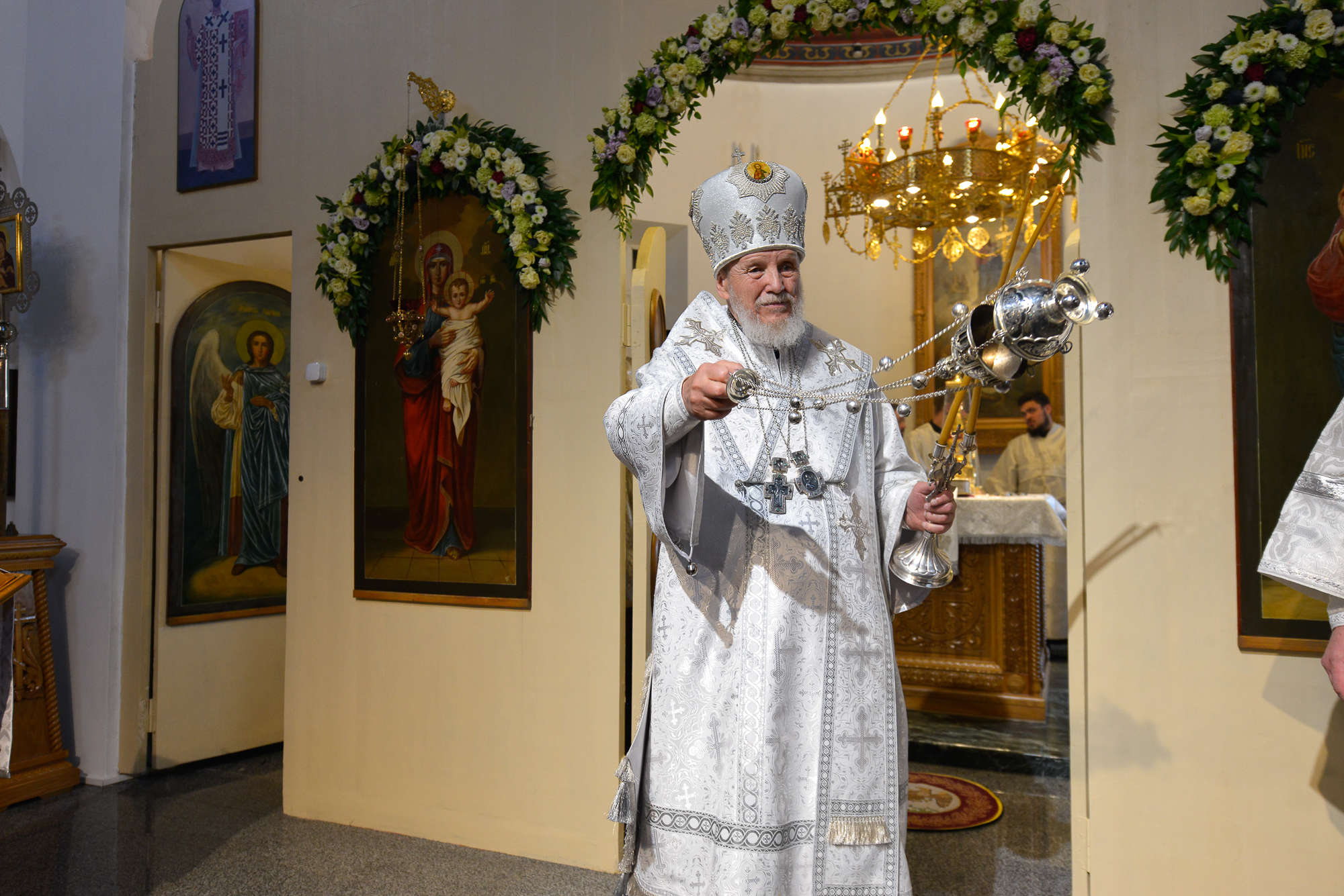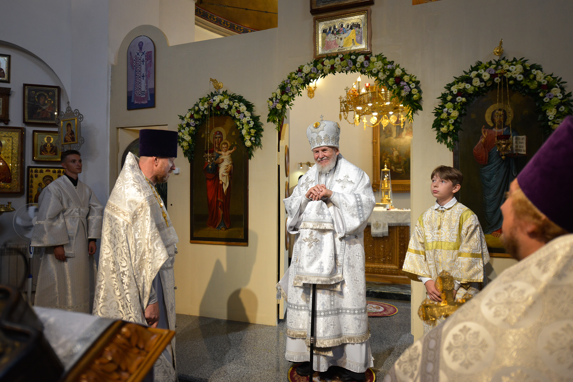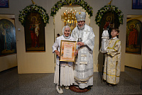 По окончании Литургии отец настоятель поблагодарил Владыку Николая за совершённое освящение храма и преподнёс ему икону Божией Матери «Казанская».