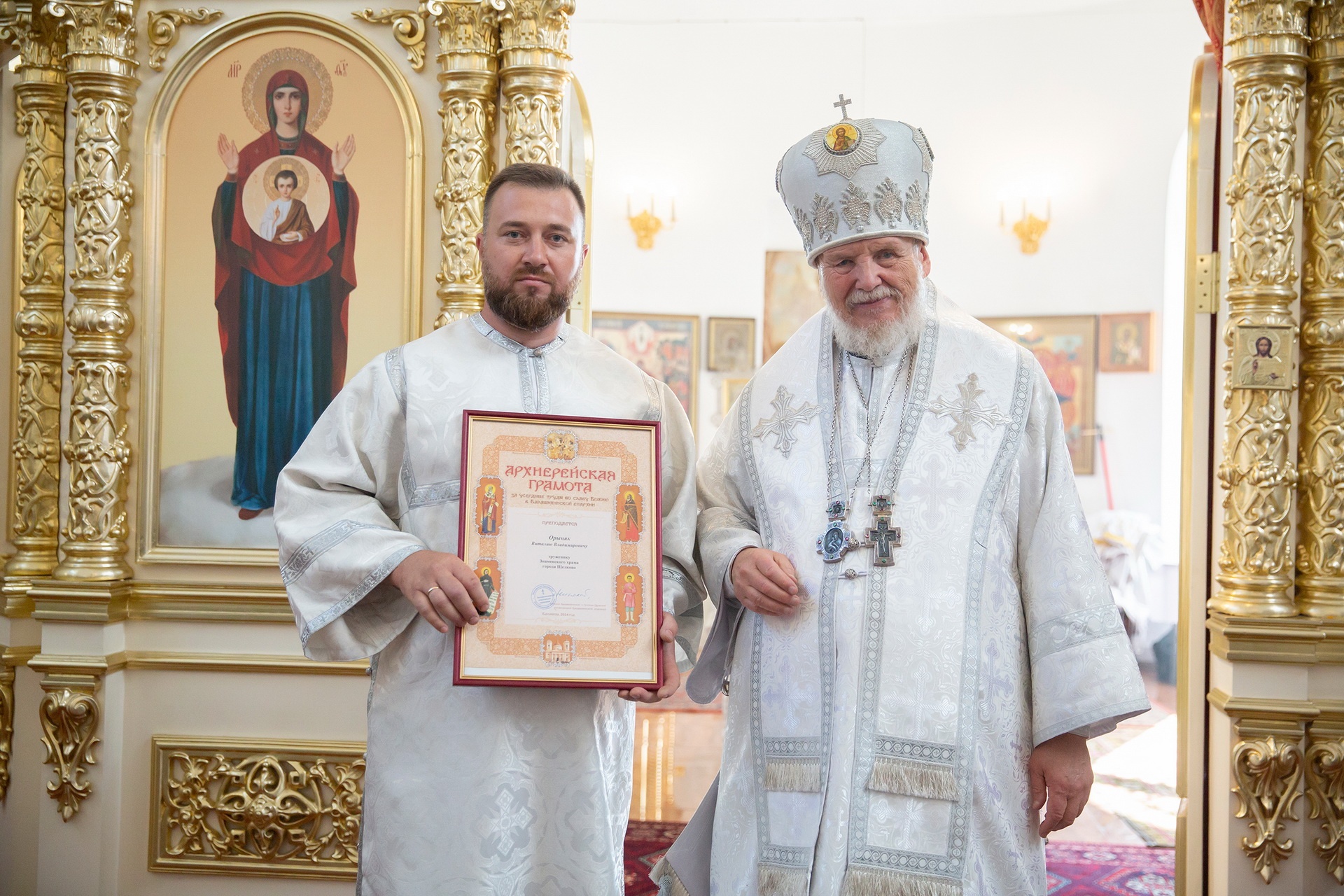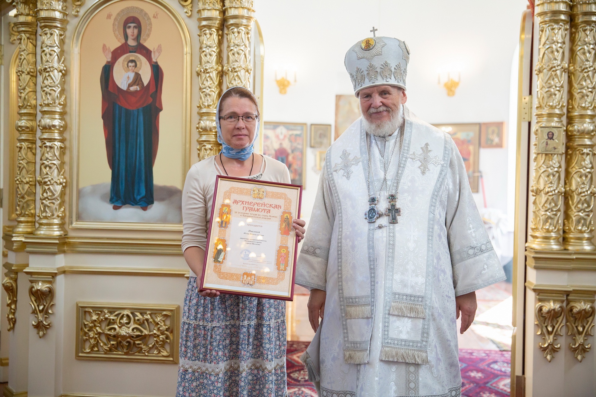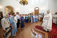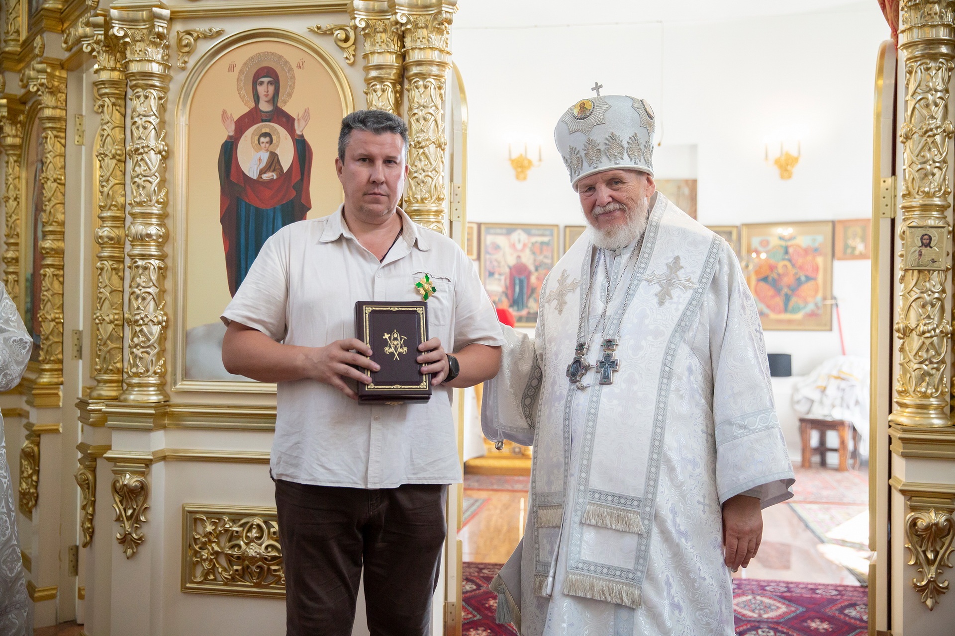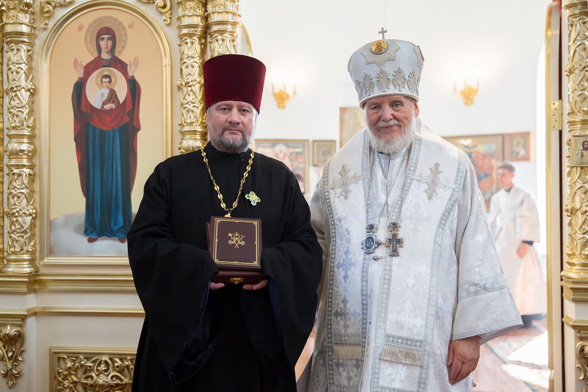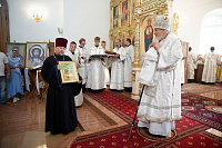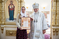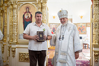 Затем Его Преосвященство обратился к сослужившему духовенству и молящимся с архипастырским словом и преподнёс церковные награды особо потрудившимся в деле восстановления храма.