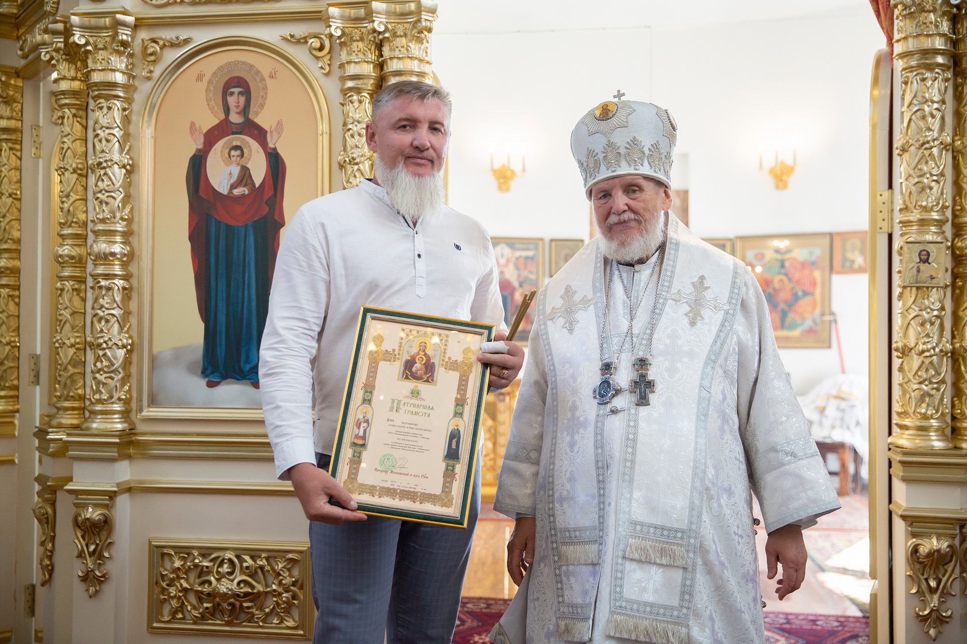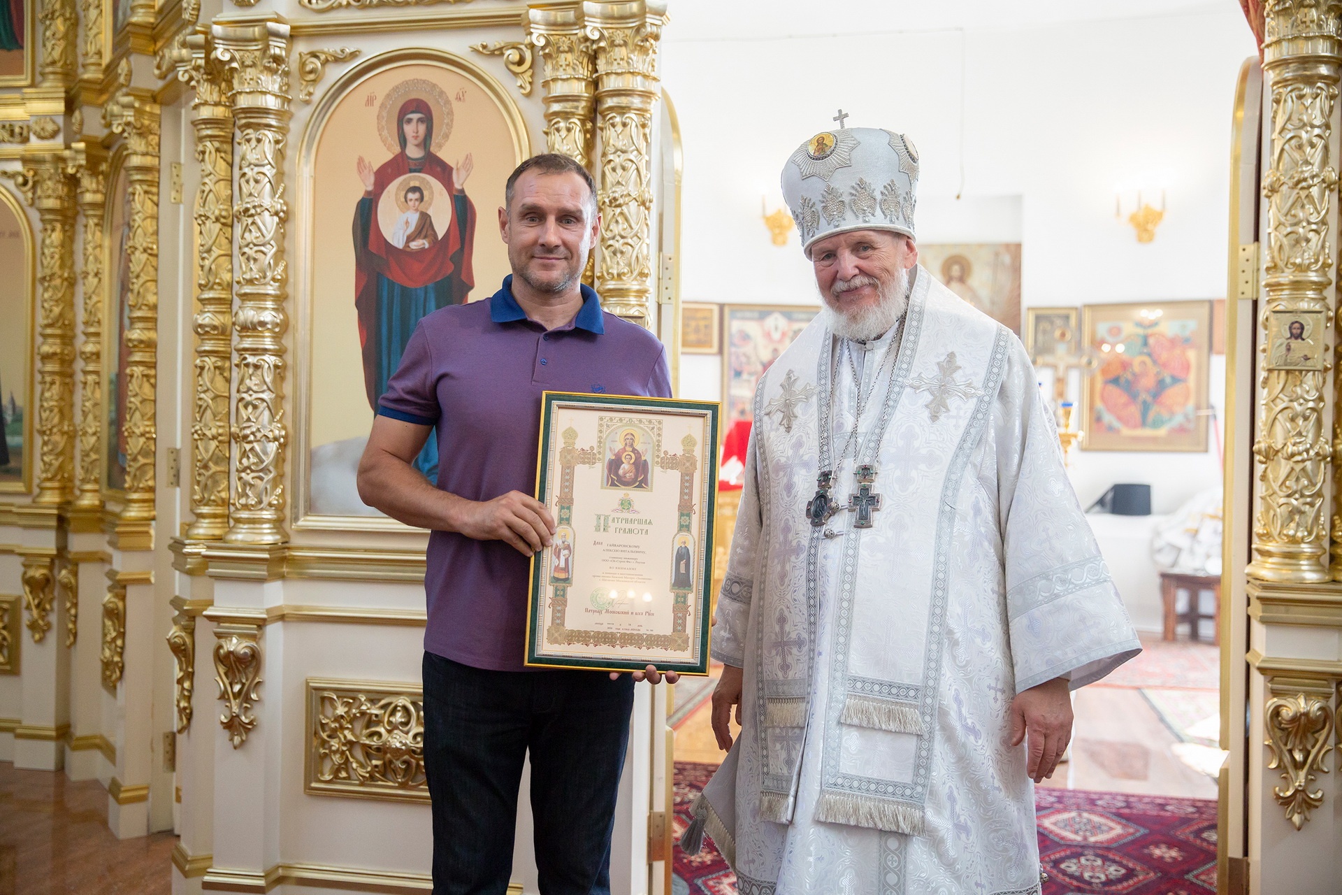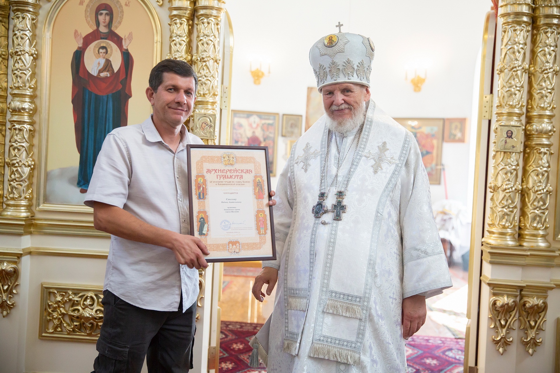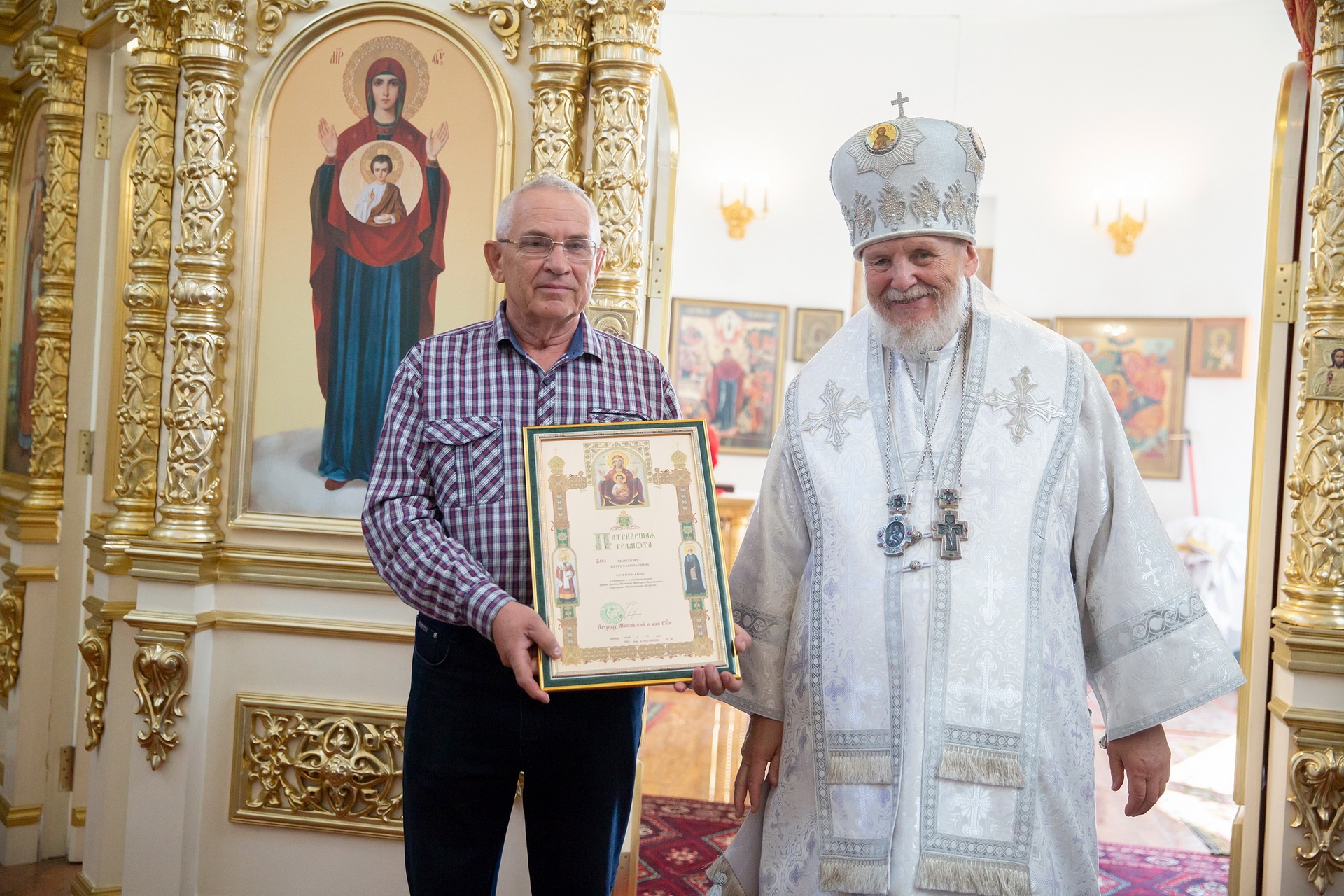 Затем Его Преосвященство обратился к сослужившему духовенству и молящимся с архипастырским словом и преподнёс церковные награды особо потрудившимся в деле восстановления храма.