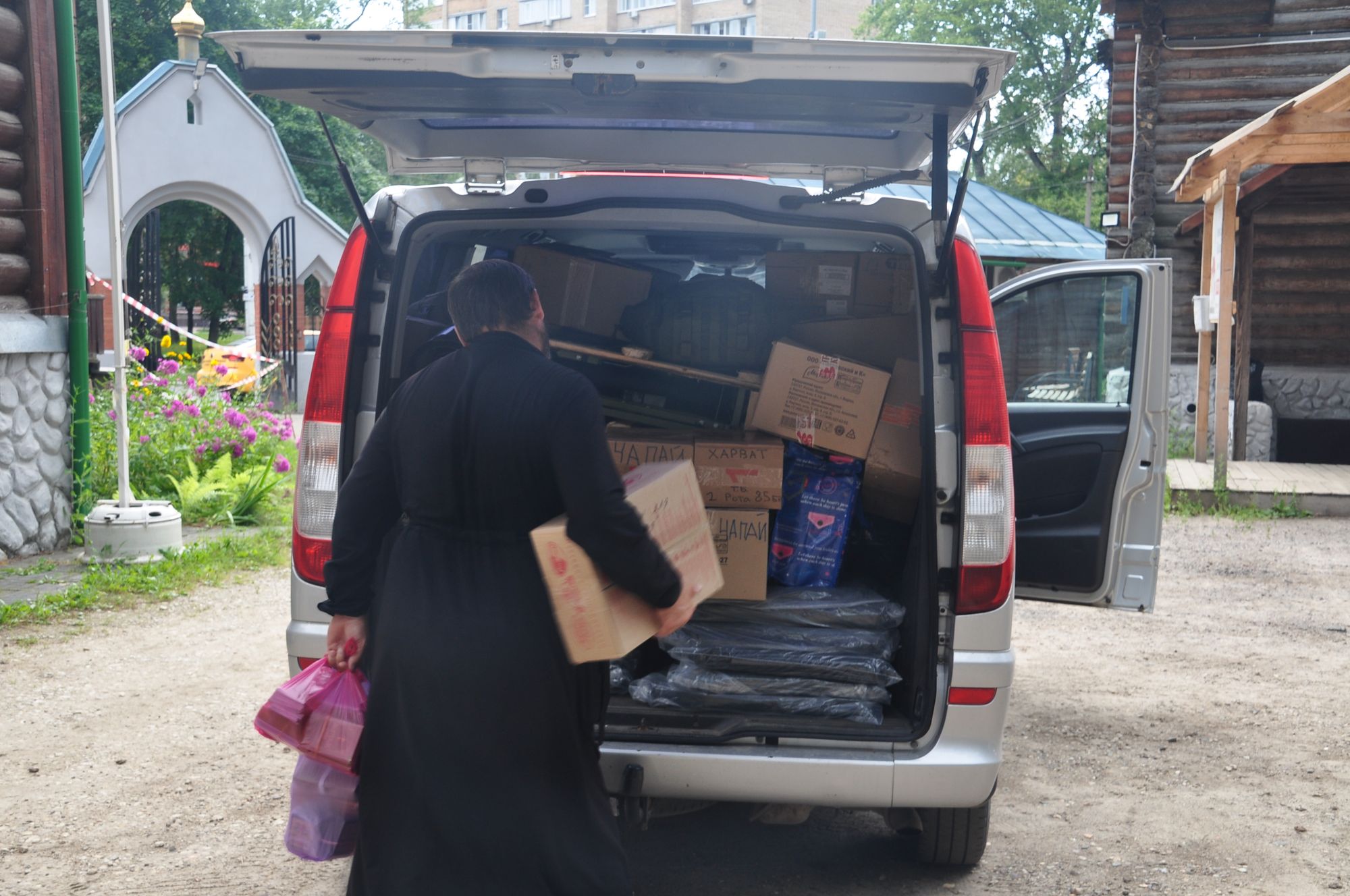 На приходе Казанского храма г. Раменское гуманитарный груз был загружен в 6 автомобилей с прицепами членами общественной организации «Русская община». Общая масса груза составила около 8 тонн.