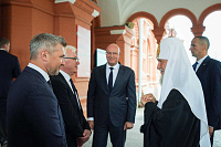 У входа в здание Выставочного комплекса Государственного исторического музея Предстоятеля Русской Православной Церкви встречали: заместитель председателя Правительства Российской Федерации, сопредседатель Оргкомитета по празднования 500-летия Новодевичьего монастыря Д.Н. Чернышенко; первый заместитель министра культуры Российской Федерации С.Г. Обрывалин; генеральный директор Государственного исторического музея А.К. Левыкин.