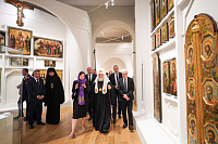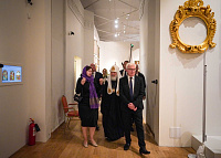 В сопровождении Д.Н. Чернышенко, С.Г. Обрывалина и А.К. Левыкина Святейший Патриарх Кирилл ознакомился с экспозицией. Пояснения давала заместитель генерального директора Исторического музея по фондовой работе М.В. Чистякова.