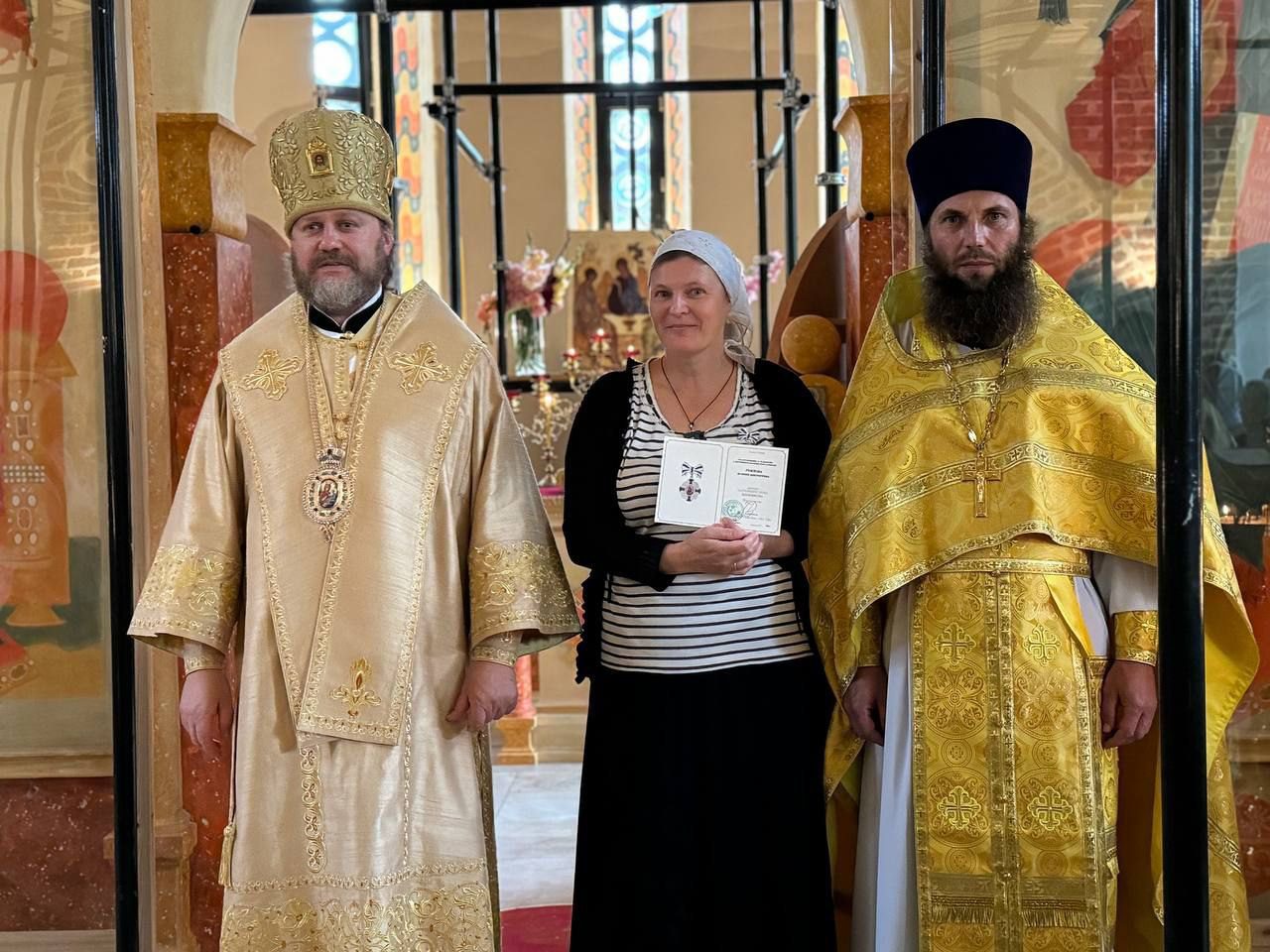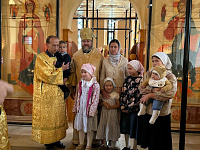 По окончании богослужения архиепископ Фома обратился к собравшимся с приветственным словом и вручил Патриарший знак Материнства многодетным матерям за труды по воспитанию детей и на благо Святой Церкви.