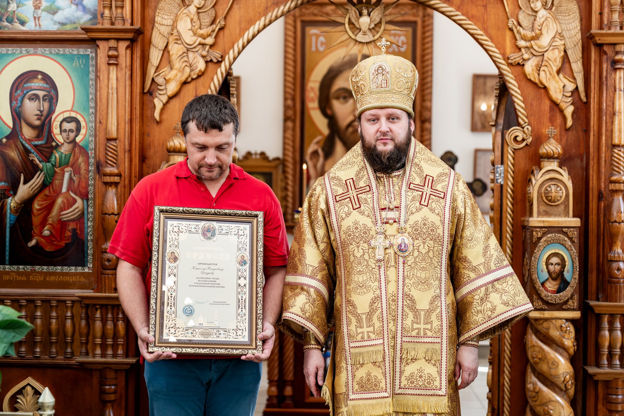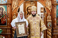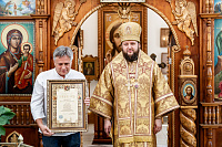Затем архиепископ Аксий вручил архиерейские грамоты благотворителям, которые внесли особый вклад в благоустройство храма, и обратился к молящимся с архипастырским словом.