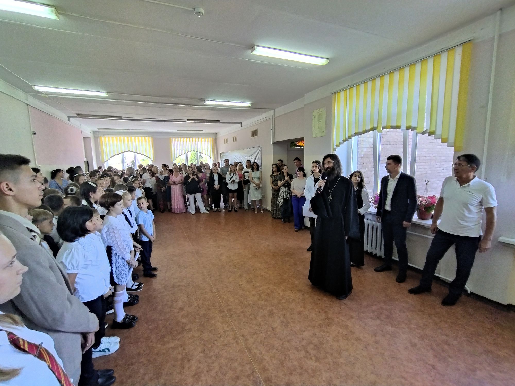 В первом корпусе школы №19 деревни Медвежьи Озёра к учителям и школьникам с напутственным словом обратился настоятель храма мученика Иоанна Воина деревни Никифорово священник Василий Вылчу.