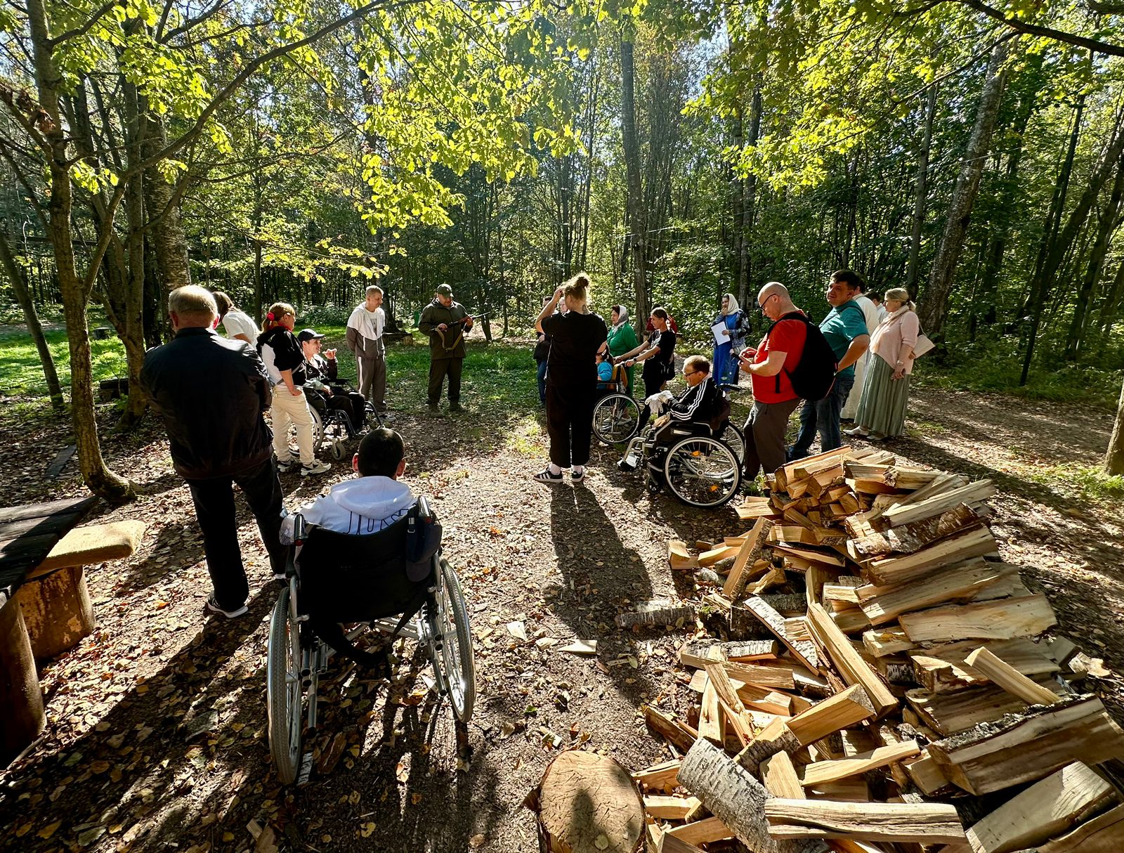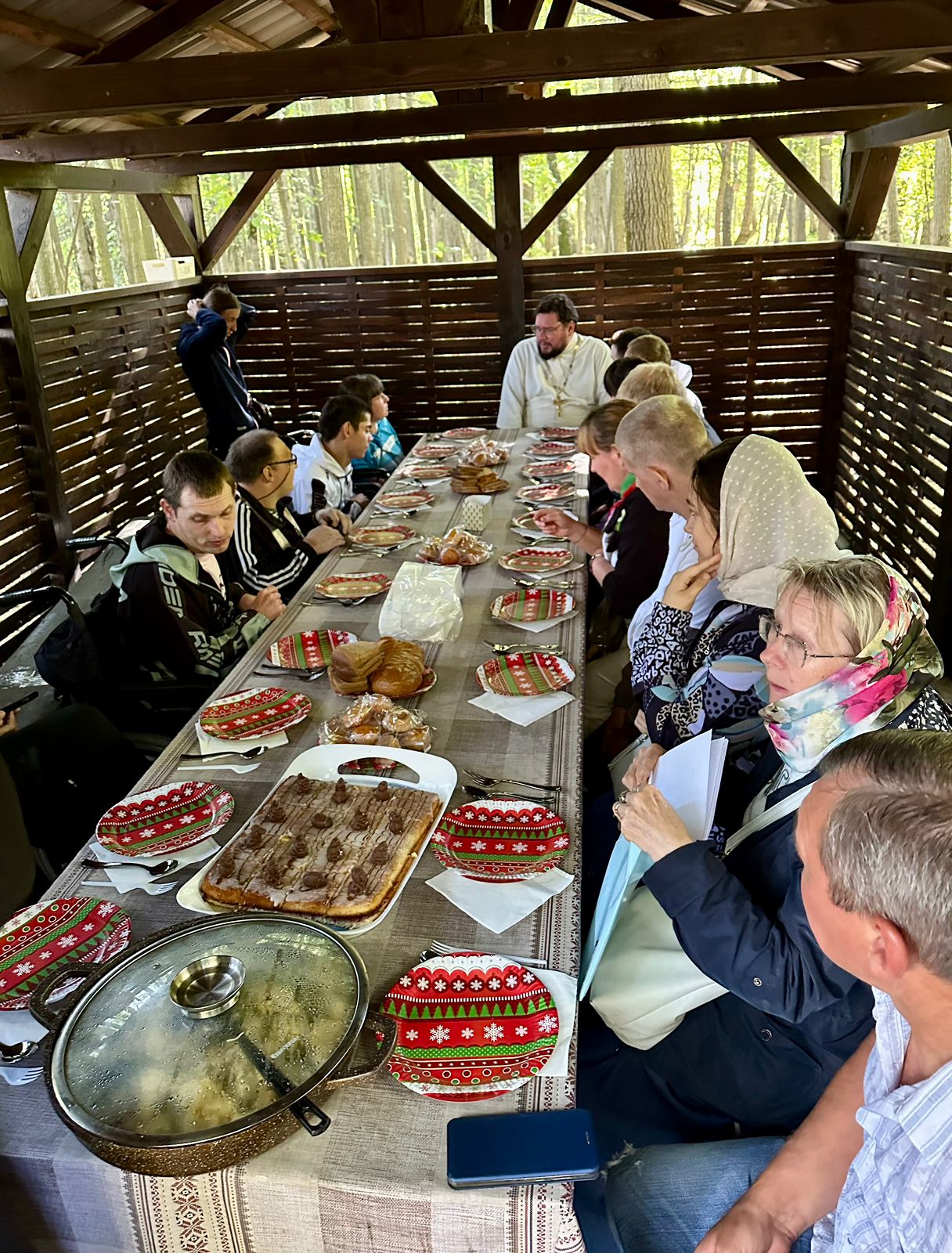По окончании общей благодарственной молитвы и проповеди гостей пригласили в приходской Экопарк, где для них было организовано угощение. Прихожане и волонтеры накрыли стол прямо под открытым небом, организовали чаепитие.