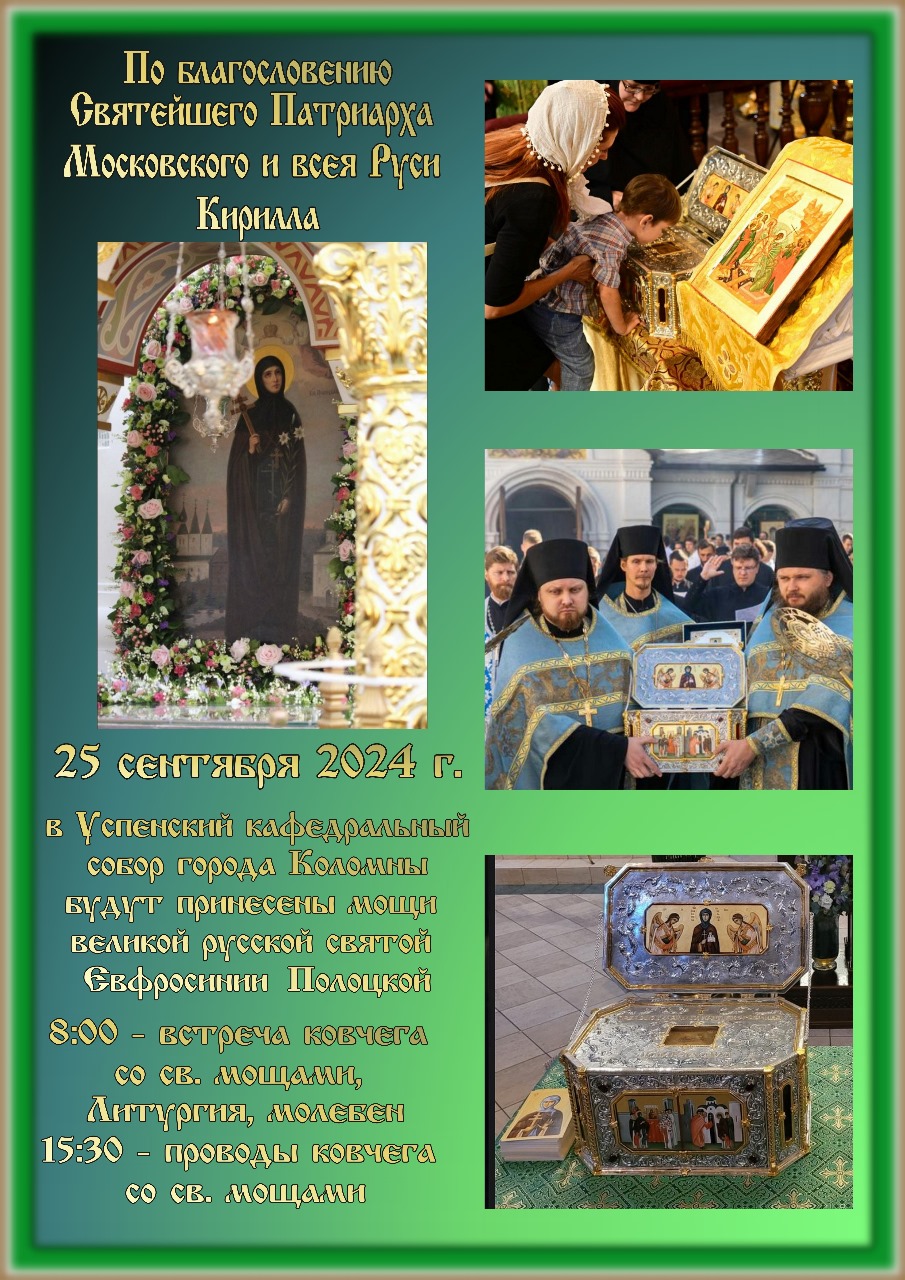 25 сентября 2024 года в Успенский кафедральный собор города Коломны по благословению Святейшего Патриарха Московского и всея Руси Кирилла будет принесён для молитвенного поклонения ковчег с частицей мощей прп. Евфросинии Полоцкой.