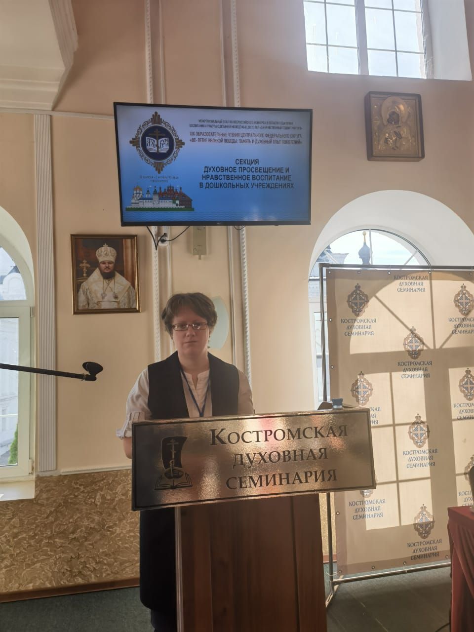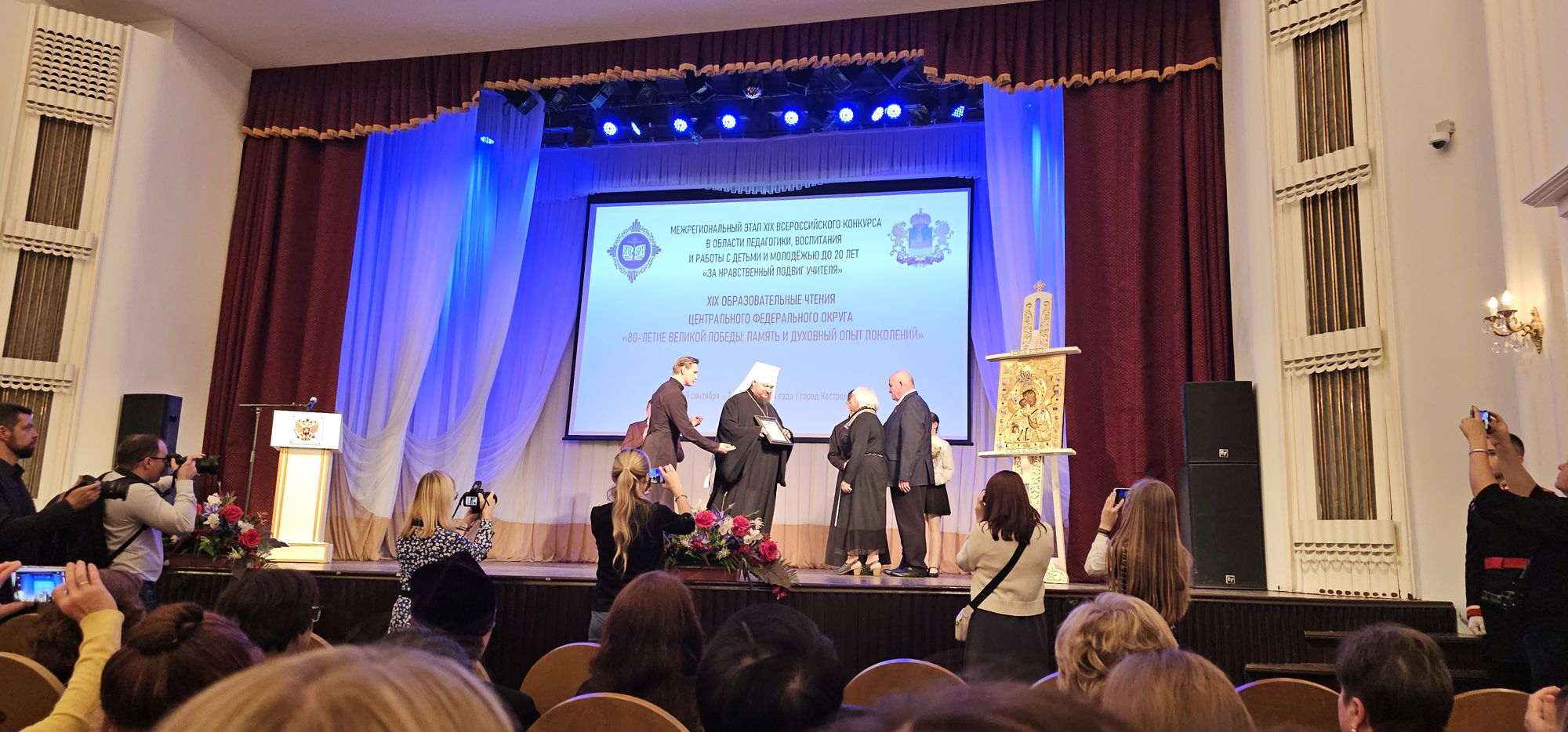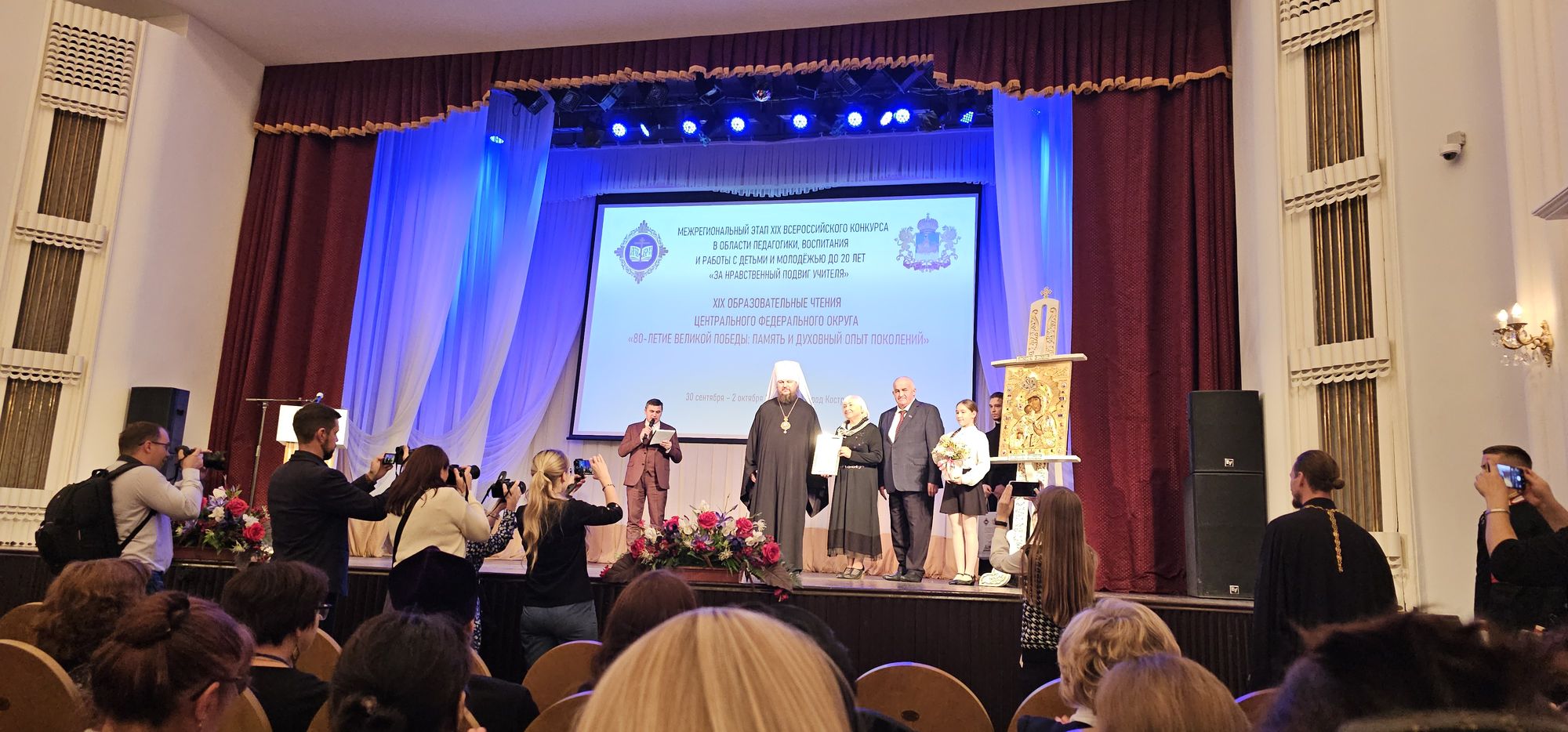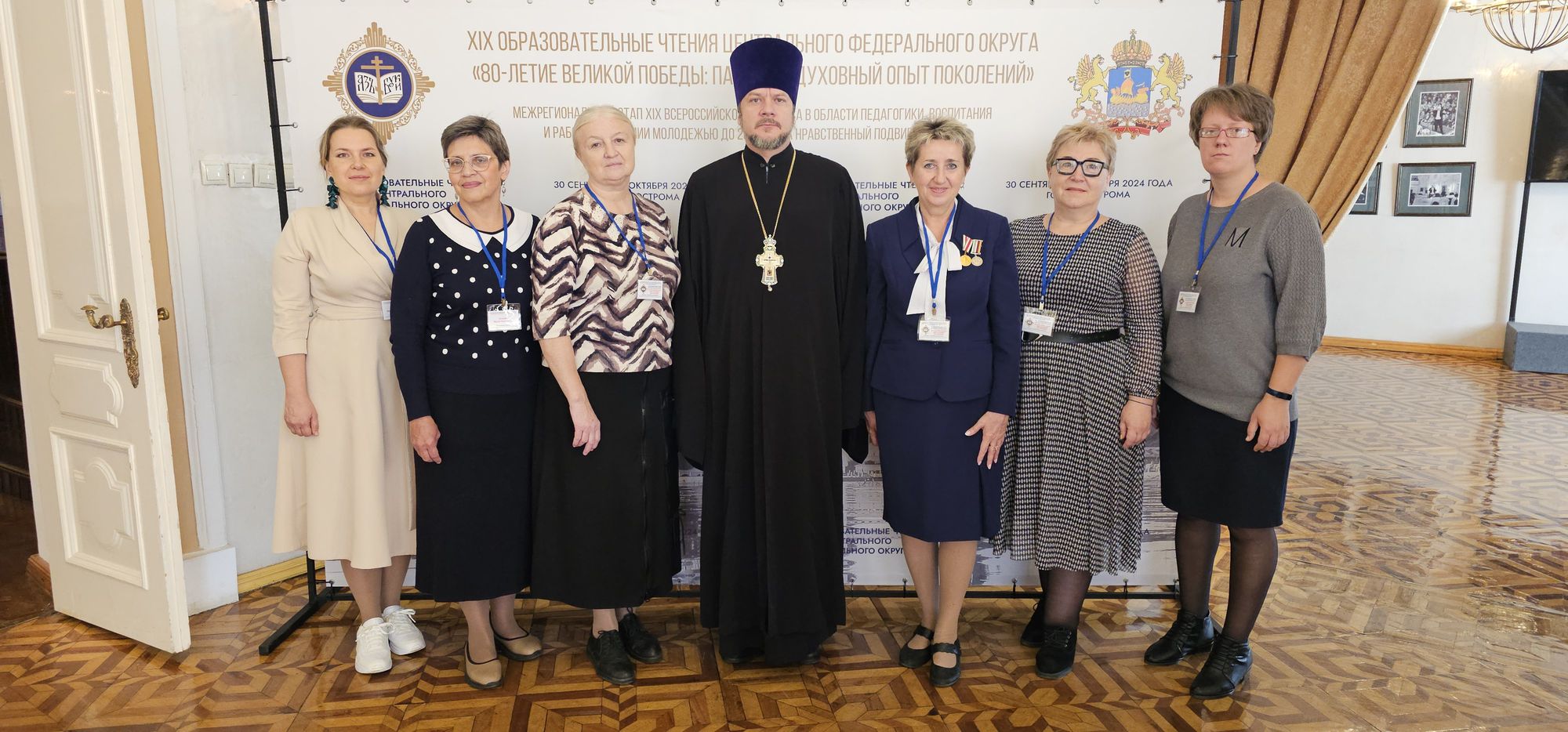 С 30 сентября по 2 октября 2024 года в г. Костроме проходили XIX Образовательные чтения Центрального федерального округа по теме «80-летие Великой Победы: память и духовный опыт поколений». В рамках чтений состоялось подведение итогов межрегионального этапа XIX Всероссийского конкурса в области педагогики, воспитания и работы с детьми и молодёжью до 20 лет «За нравственный подвиг учителя». В работе пленарного заседания, праздничном концерте, тематических секциях и церемонии закрытия чтений приняли участие духовенство и педагоги из 18 регионов страны. На торжественные мероприятия в г. Кострому от Московской области прибыла делегация педагогов, которую возглавили заместитель директора МОЦ Останкинской средней общеобразовательной школы, г.о. Дмитровский, кандидат педагогических наук, вице- президент Ассоциации педагогов Московской области «Преподаватели духовно-нравственной (православной) культуры» О.В. Чуб и председатель Межъепархиального отдела по координации духовно-просветительской, образовательной деятельности Московской митрополии протоиерей Сергий Якимов.