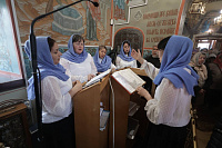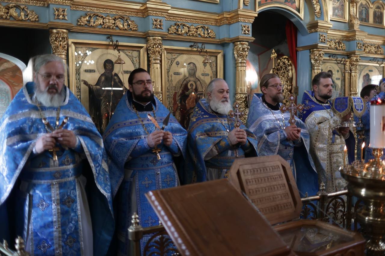 Затем в Зачатьевском храме города Чехова иерей Константин Семёнов в сослужении духовенства Чеховского благочиния и сопровождающего святыню иерея Константина Быкова совершил Божественную литургию и молебен о даровании Победы. Богослужебные песнопения исполнил хор Зачатьевского храма под управлением Т.С.Дошиной. За богослужением молились М.Н.Собакин, паломники и прихожане храма. По окончании богослужений молящимся вручались иконы Божией Матери «Казанская» с благословением Патриарха Московского и всея Руси Кирилла. В течение двух дней пребывания иконы в Подольской епархии будут совершаться молебные пения.