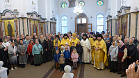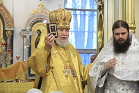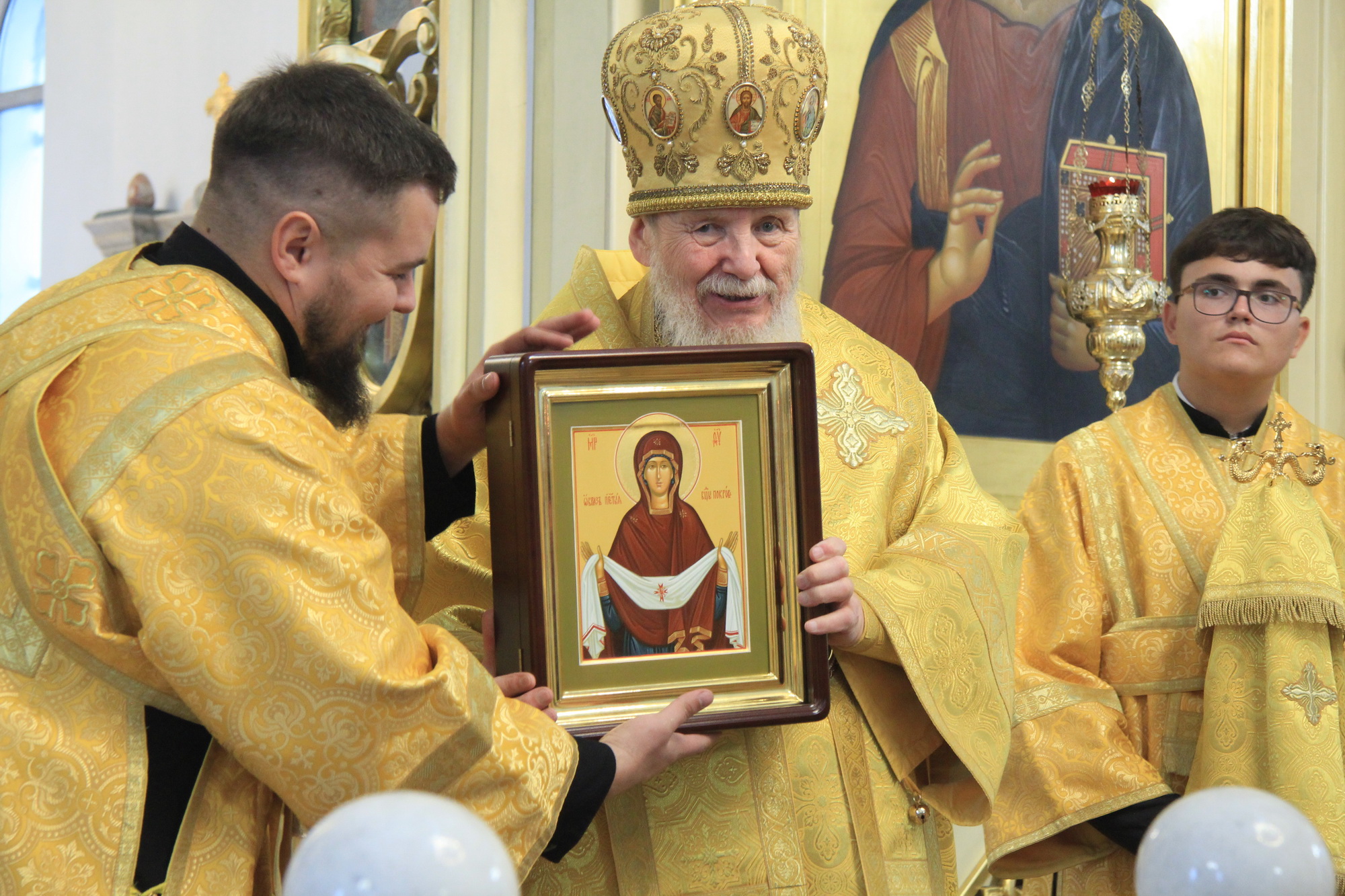 По заамвонной молитве были возглашены уставные многолетия, после чего отец Евмений поблагодарил Владыку Николая за совершённое богослужение и преподнёс ему икону Покрова Божией Матери.