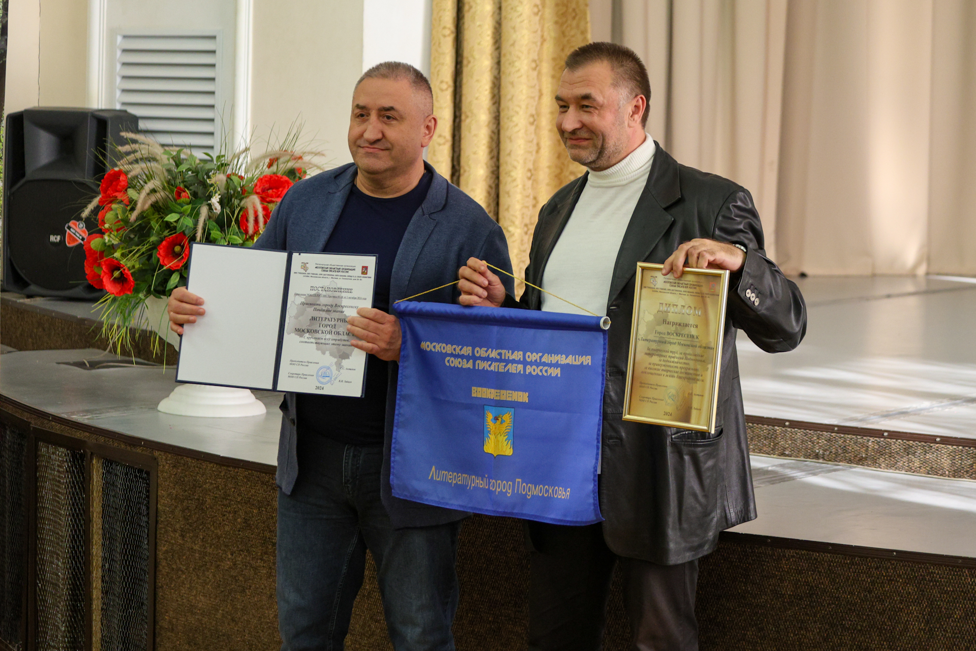 Секретарь Союза писателей России, председатель правления Московской областной организации Союза писателей России Сергей Сергеевич Антипов огласил постановление о присвоении г. Воскресенск Почётного звания «Литературный город Московской области». Председатель Совета депутатов городского округа Воскресенск Сергей Васильевич Матвиенко Васильевич вручил за плодотворный труд, высокий профессионализм, большой вклад в развитие литературного творчества на территории Московской области литераторам награды министра культуры и туризма Московской области Василия Сергеевича Кузнецова и главы городского округа Воскресенск Алексея Валерьевича Малкина.