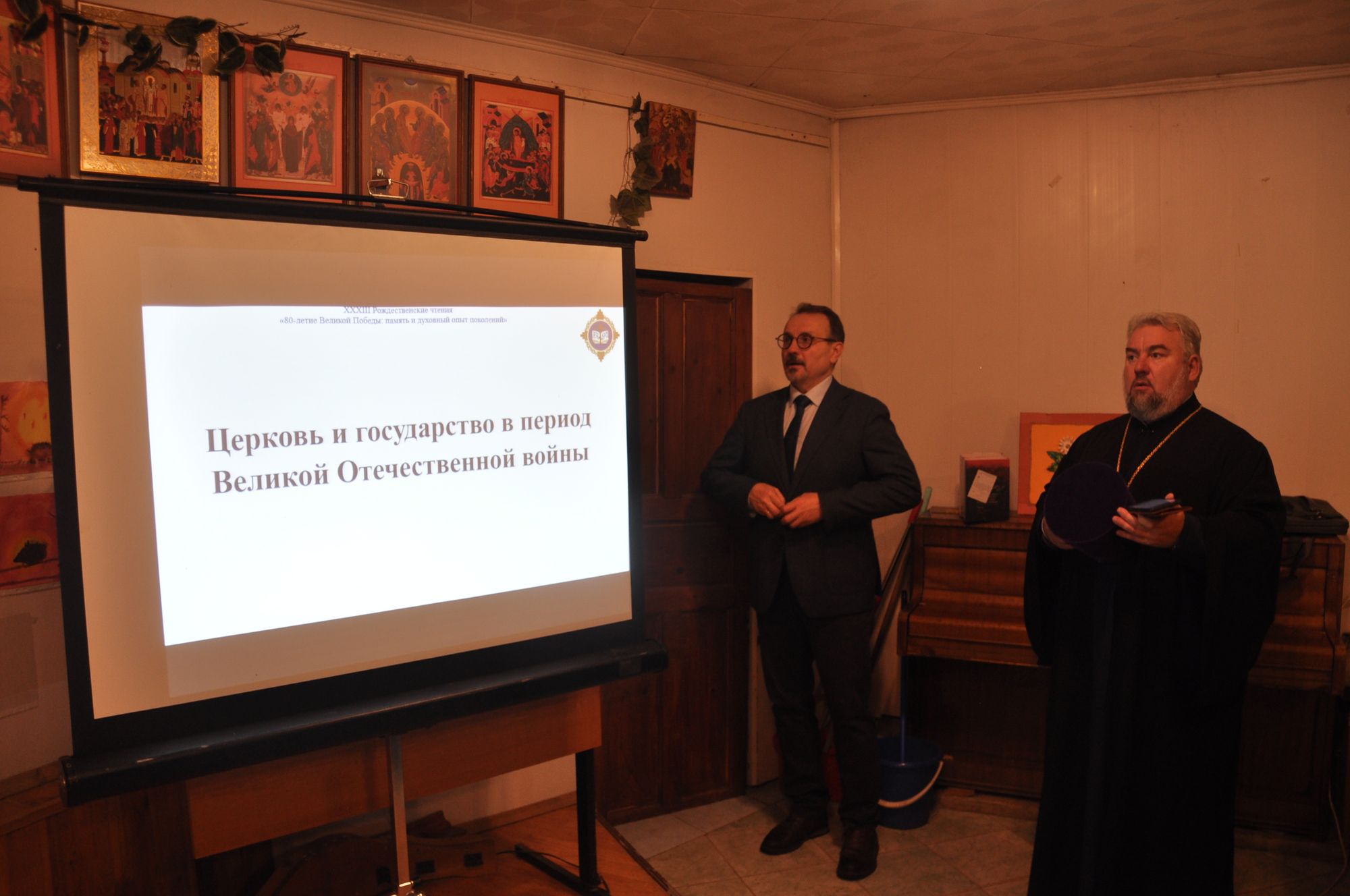 После награждения в здании воскресной школы в рамках Рождественских чтений доцентом ГГУ Никоновым В.В. был прочитан доклад на тему «Церковь и государство в период Великой Отечественной войны».