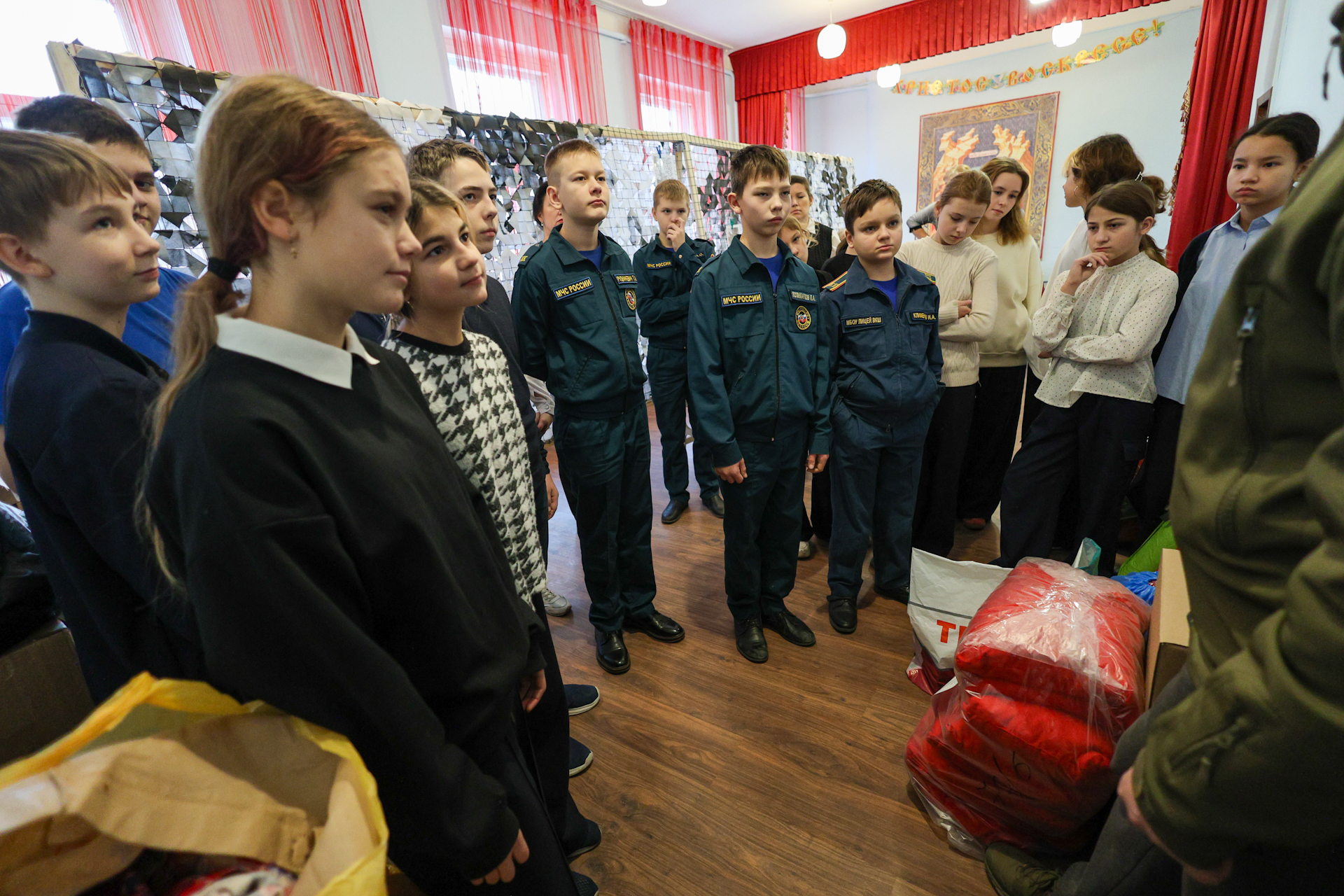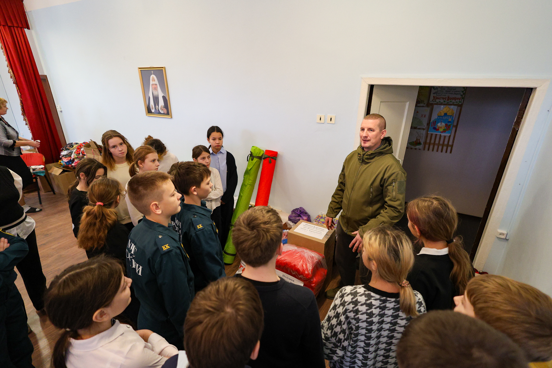 29 ноября мастерскую посетили учащиеся 6-го класса МБОУ-лицея «Воскресенская кадетская школа» с. Усадище в сопровождении классного руководителя и педагога по технологии. Ребята узнали для чего нужны маскировочные сети, каких расцветок они бывают, познакомились с этапами подготовки необходимых материалов и непосредственно с плетением сетей. Так же ребята познакомились с волонтёром, сопровождающим гуманитарные грузы в зону проведения спецоперации. Задали ему различные вопросы и помогли погрузить подготовленный мастерской гуманитарный груз для госпиталя и одной из штурмовых бригад. Ребята забрали с собой целый мешок лент в школу, где учащиеся 8-го класса смотали все ленты в рулончики (подготовили для плетения сетей), тем самым оказав посильную помощь мастерицам.