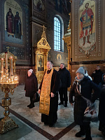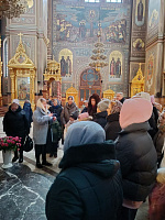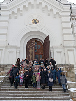 По прибытии в монастырь группа проследовала на экскурсию по храмам обители. Экскурсовод рассказала об истории и святынях монастыря, а затем иерей Илия совершил молебен перед мощами святителя Николая Чудотворца с поминовением участников поездки. Далее было выделено свободное время для фотографирования и посещения монастырской трапезной, после чего, помолившись, отправились в обратный путь.