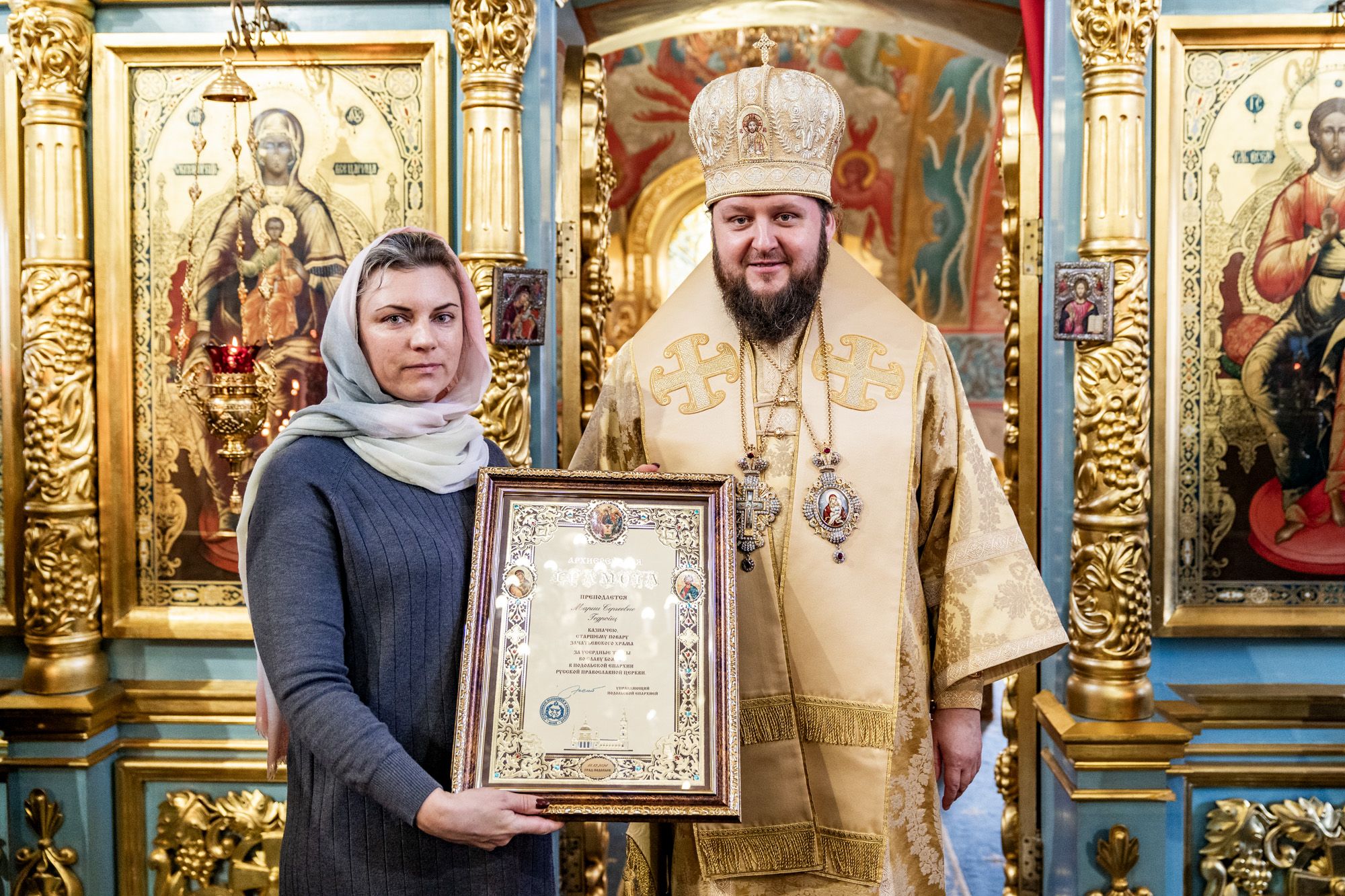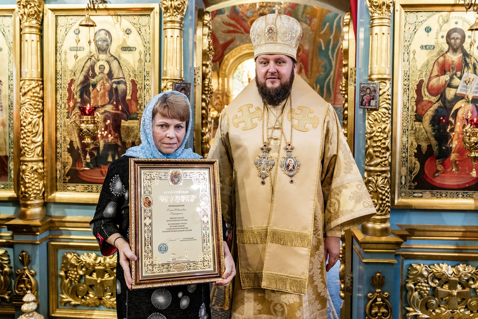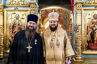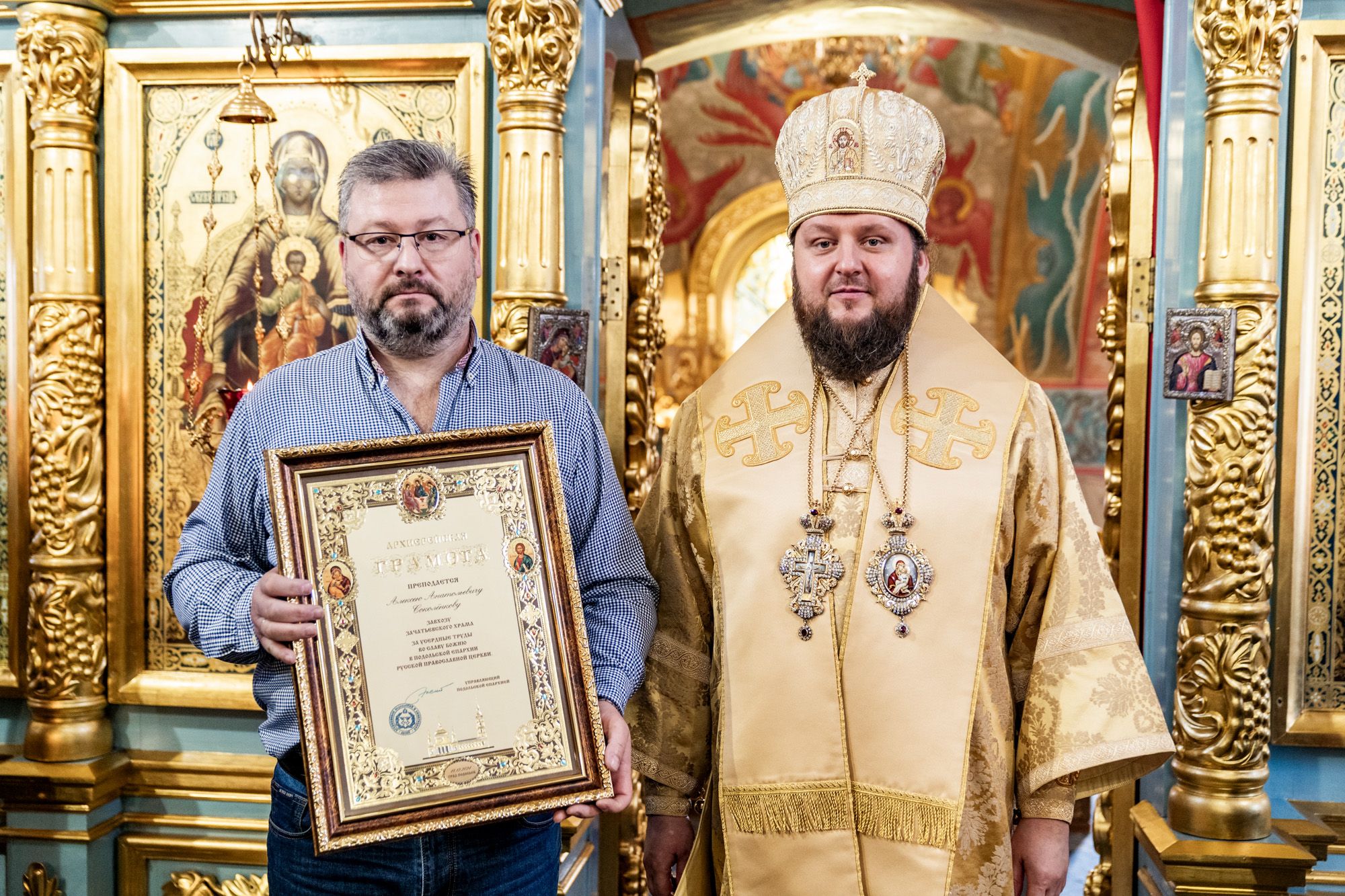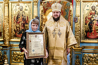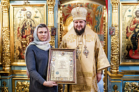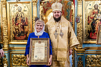 Затем владыка вручил настоятелю Христорождественского храма села Сенино г.о. Чехов протоиерею Василию Евпатову медаль преподобного Сергия Радонежского, заместителю заведующего отделом разграничения прав на имущество министерства имущественных отношений Московской области А.В.Бочарову – орден преподобного Серафима Саровского III степени, а также архиерейские грамоты активным прихожанам Зачатьевского храма.