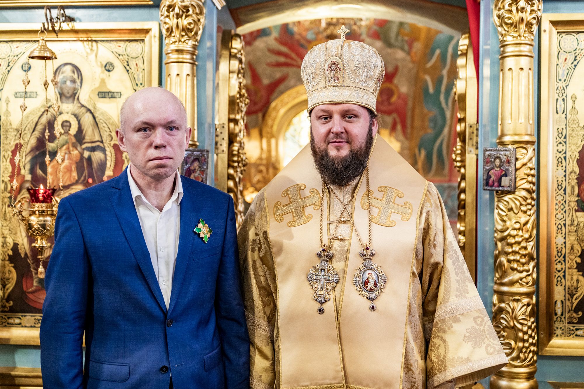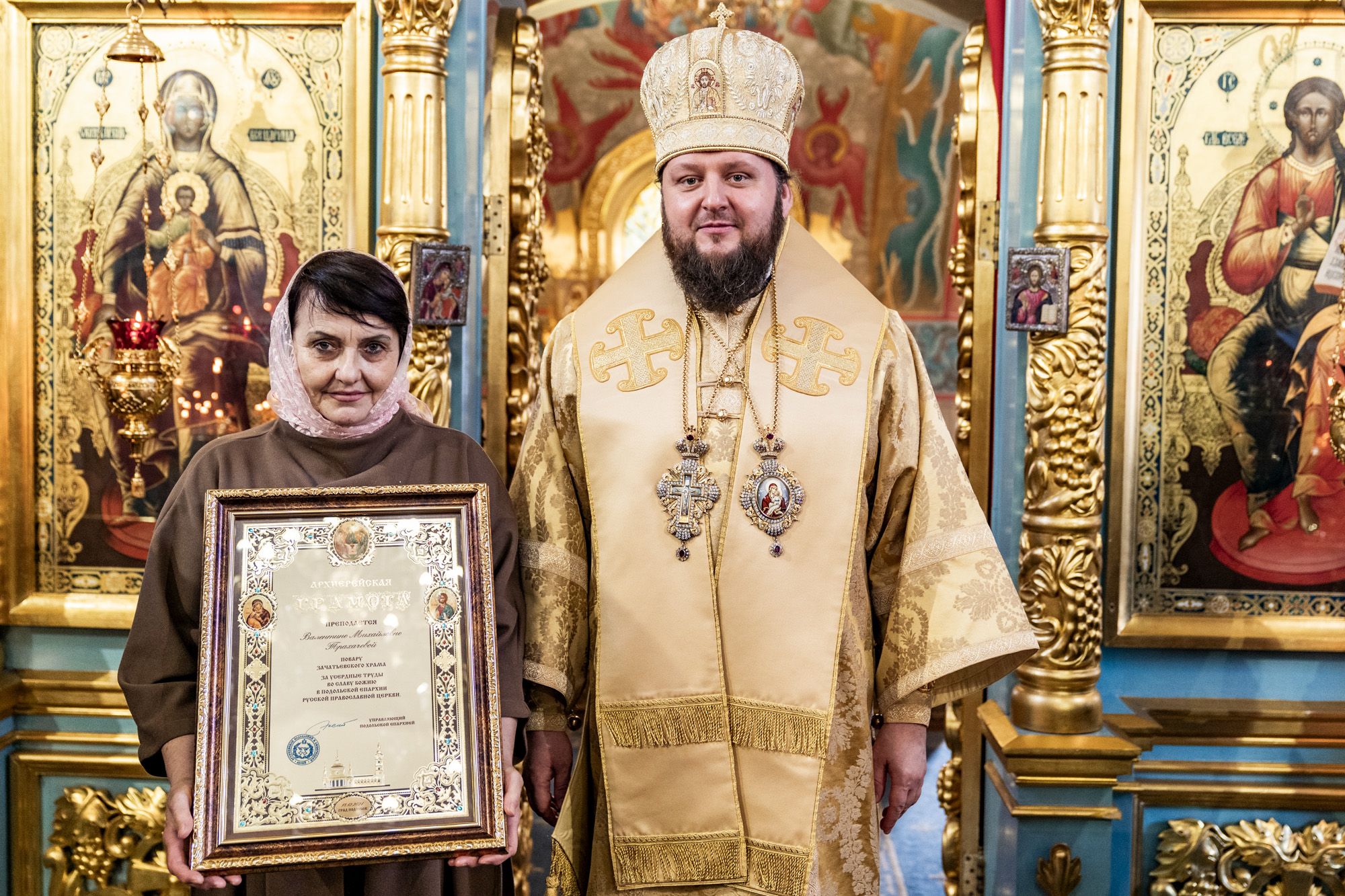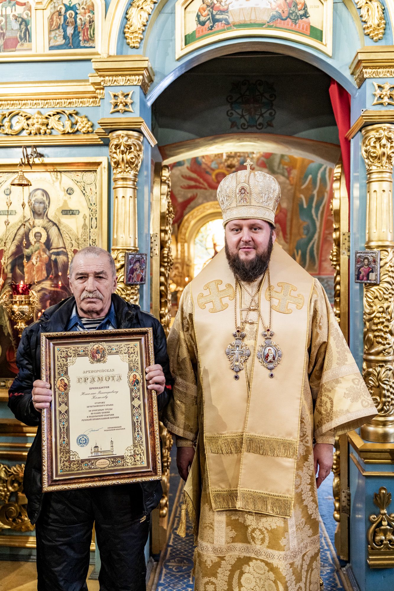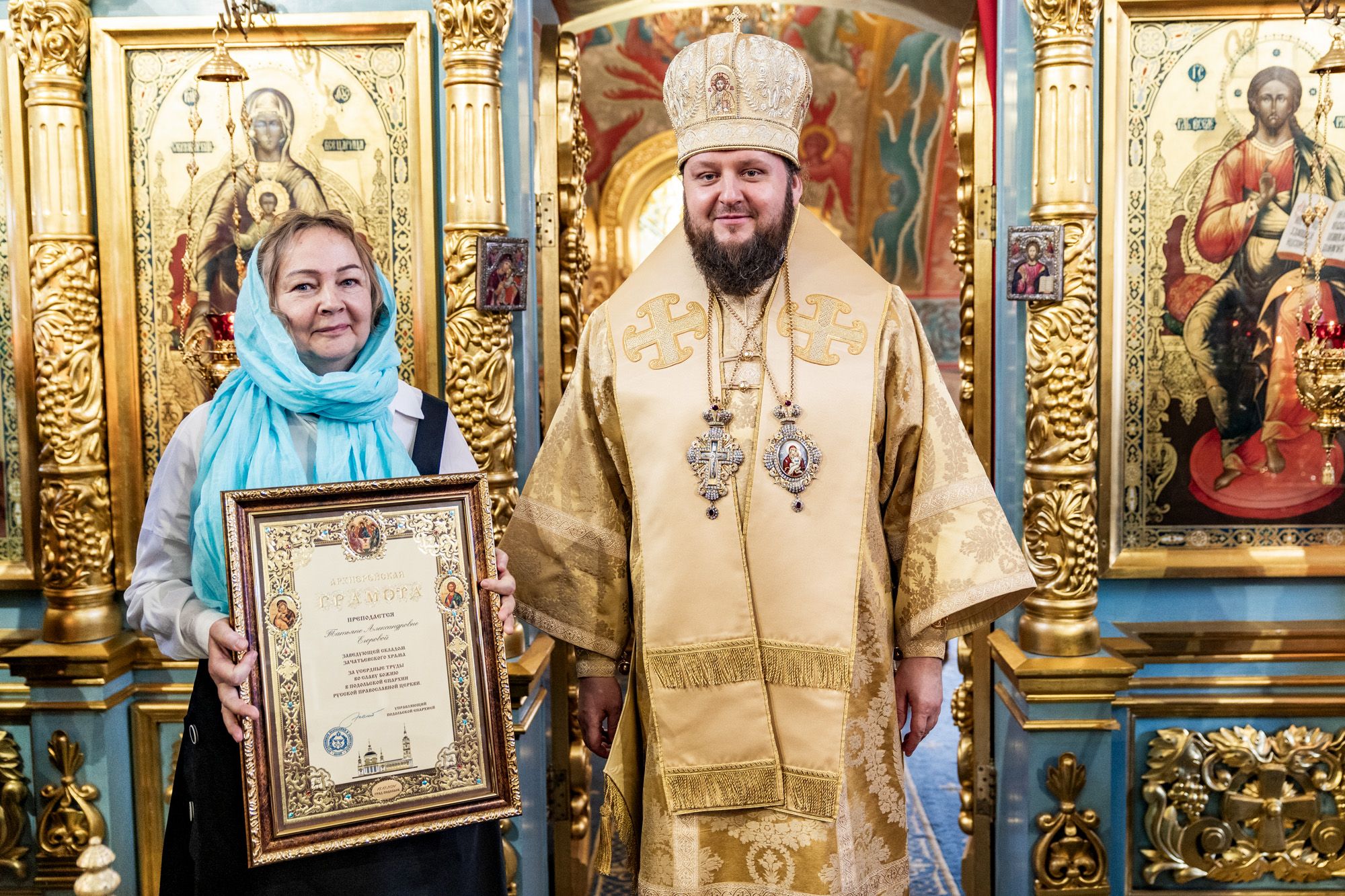 Затем владыка вручил настоятелю Христорождественского храма села Сенино г.о. Чехов протоиерею Василию Евпатову медаль преподобного Сергия Радонежского, заместителю заведующего отделом разграничения прав на имущество министерства имущественных отношений Московской области А.В.Бочарову – орден преподобного Серафима Саровского III степени, а также архиерейские грамоты активным прихожанам Зачатьевского храма.