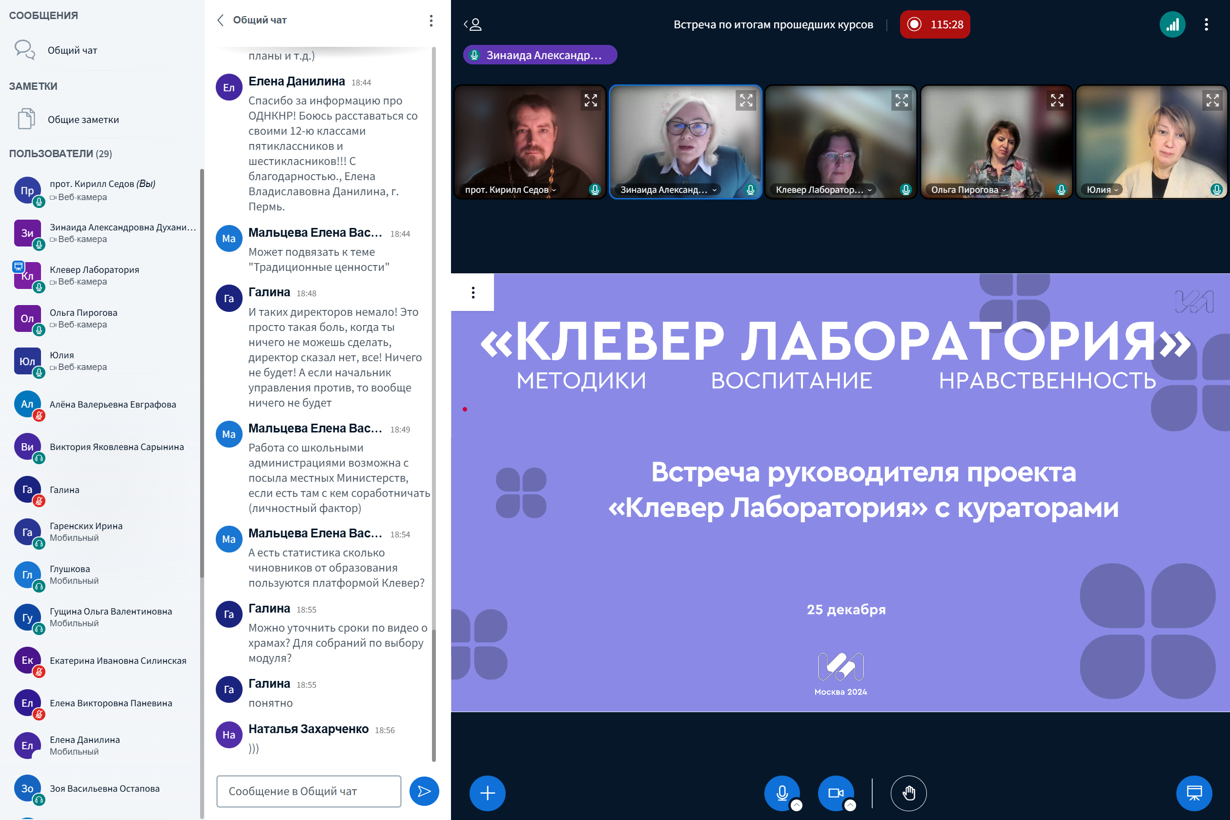 25 декабря 2024 года для руководителей и кураторов образовательно-просветительского проекта «Клевер Лаборатория» состоялось очередное онлайн-совещание «Встреча по итогам прошедших курсов».