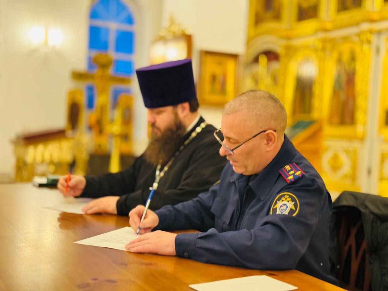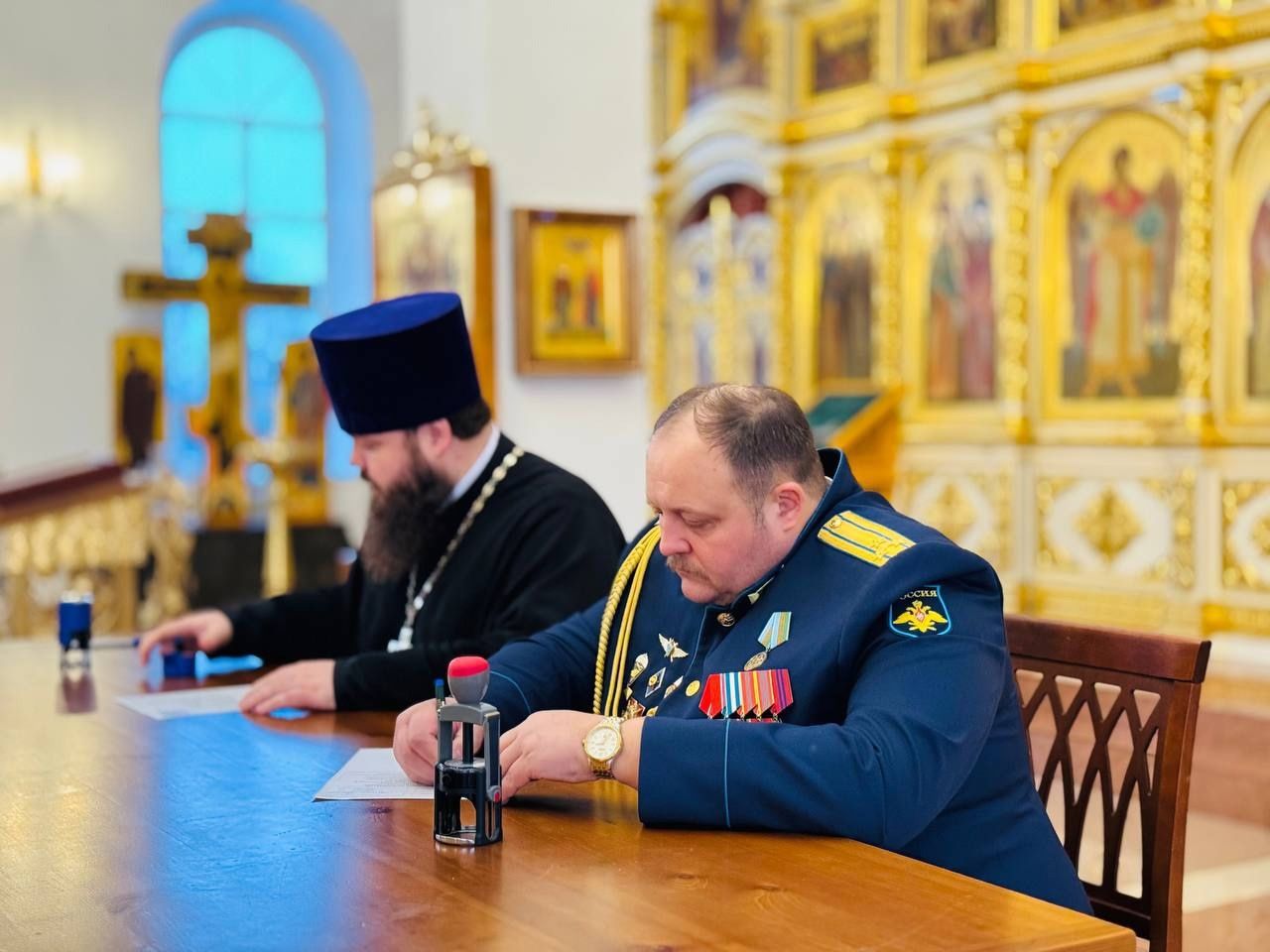 В начале встречи благочинный Павлово-Посадского церковного округа священник Александр Анохин совершил молебен о защитниках Отечества, после чего были подписаны планы совместных мероприятий упомянутых ведомств с Павлово-Посадским благочинием на 2025 год.