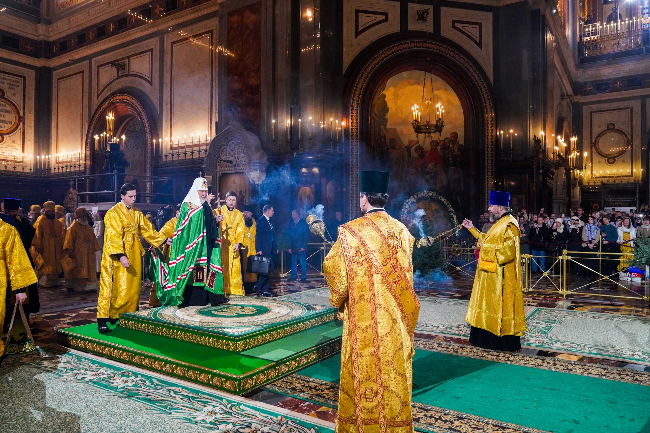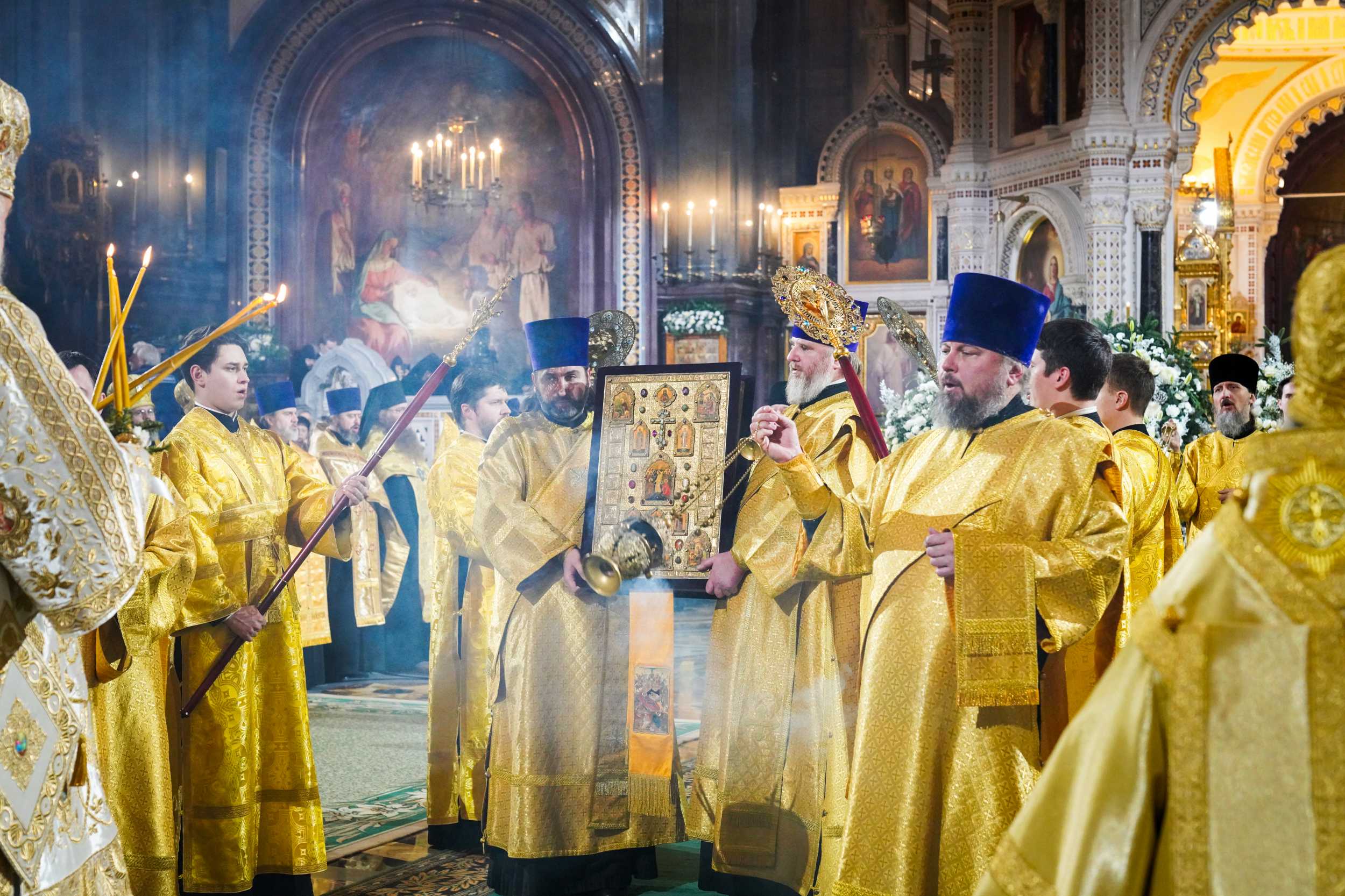 Евангельское зачало было прочитано Предстоятелем Русской Православной Церкви по старинному напрестольному Евангелию времен императрицы Елизаветы Петровны, которое выносится из алтаря Храма Христа Спасителя дважды в год: на Рождественскую и Пасхальную великую вечерни.