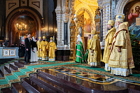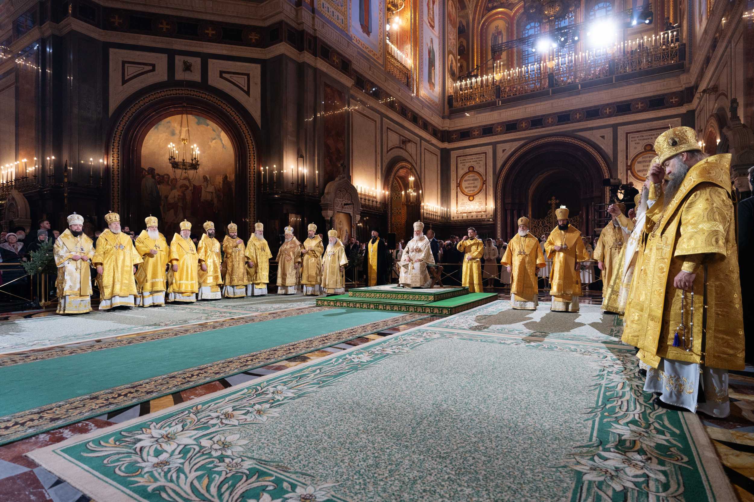 Его Святейшеству сослужили: митрополит Ювеналий (Поярков); митрополит Крутицкий и Коломенский Павел, Патриарший наместник Московской митрополии; митрополит Воскресенский Григорий, управляющий делами Московской Патриархии, первый викарий Патриарха Московского и всея Руси по г. Москве, наместник Новоспасского ставропигиального монастыря; митрополит Волоколамский Антоний, председатель Отдела внешних церковных связей; митрополит Владимирский и Суздальский Никандр, председатель Финансово-хозяйственного управления Московского Патриархата; митрополит Валентин (Мищук); митрополит Пантелеимон (Долганов); митрополит Тихон (Емельянов); митрополит Серафим (Зализницкий); митрополит Игнатий (Пологрудов); митрополит Каширский Феогност, председатель Синодального отдела по монастырям и монашеству, наместник Донского ставропигиального монастыря; митрополит Иоанн (Рощин); митрополит Звенигородский Арсений; архиепископ Филарет (Карагодин); архиепископ Одинцовский и Красногорский Фома, руководитель Административного секретариата Московской Патриархии; архиепископ Подольский и Люберецкий Аксий; архиепископ Зеленоградский Савва, заместитель управляющего делами Московской Патриархии; епископ Гурий (Шалимов); епископ Видновский Тихон, наместник Екатерининского ставропигиального монастыря; епископ Троицкий Панкратий, председатель Синодальной комиссии по канонизации святых и Синодальной комиссии по иконописи, наместник Спасо-Преображенского Валаамского ставропигиального монастыря; епископ Серпуховской Роман, наместник Высоцкого ставропигиального монастыря; епископ Иероним (Чернышев); епископ Нектарий (Фролов); епископ Верейский Пантелеимон; епископ Балашихинский и Орехово-Зуевский Николай, главный редактор Издательства Московской Патриархии; епископ Павлово-Посадский Силуан, заместитель управляющего делами Московской Патриархии; епископ Истринский Серафим, председатель Синодального отдела по делам молодежи; епископ Солнечногорский Алексий, наместник Данилова ставропигиального монастыря; епископ Игнатий (Григорьев); епископ Озерский Порфирий, наместник Спасо-Преображенского Соловецкого ставропигиального монастыря; епископ Можайский Иосиф, наместник Введенского ставропигиального мужского монастыря Оптина пустынь; епископ Сергиево-Посадский и Дмитровский Кирилл, наместник Свято-Троицкой Сергиевой лавры; епископ Раменский Алексий, личный секретарь Святейшего Патриарха Кирилла; епископ Егорьевский Мефодий, и.о. председателя Синодальной библейско-богословской комиссии, ректор Православного Свято-Тихоновского гуманитарного университета, наместник Николо-Угрешского ставропигиального монастыря; протопресвитер Владимир Диваков, секретарь Патриарха Московского и всея Руси по г. Москве; протоиерей Михаил Рязанцев, ключарь Храма Христа Спасителя; протоиерей Николай Балашов, советник Патриарха Московского и всея Руси; протоиерей Максим Козлов, председатель Учебного комитета Русской Православной Церкви; протоиерей Игорь Якимчук, заместитель председателя ОВЦС МП; архимандрит Стефан (Тараканов), заместитель председателя Синодального отдела по монастырям и монашеству, наместник Саввино-Сторожевского ставропигиального монастыря; протоиерей Дионисий Казанцев, секретарь Патриарха Московского и всея Руси п