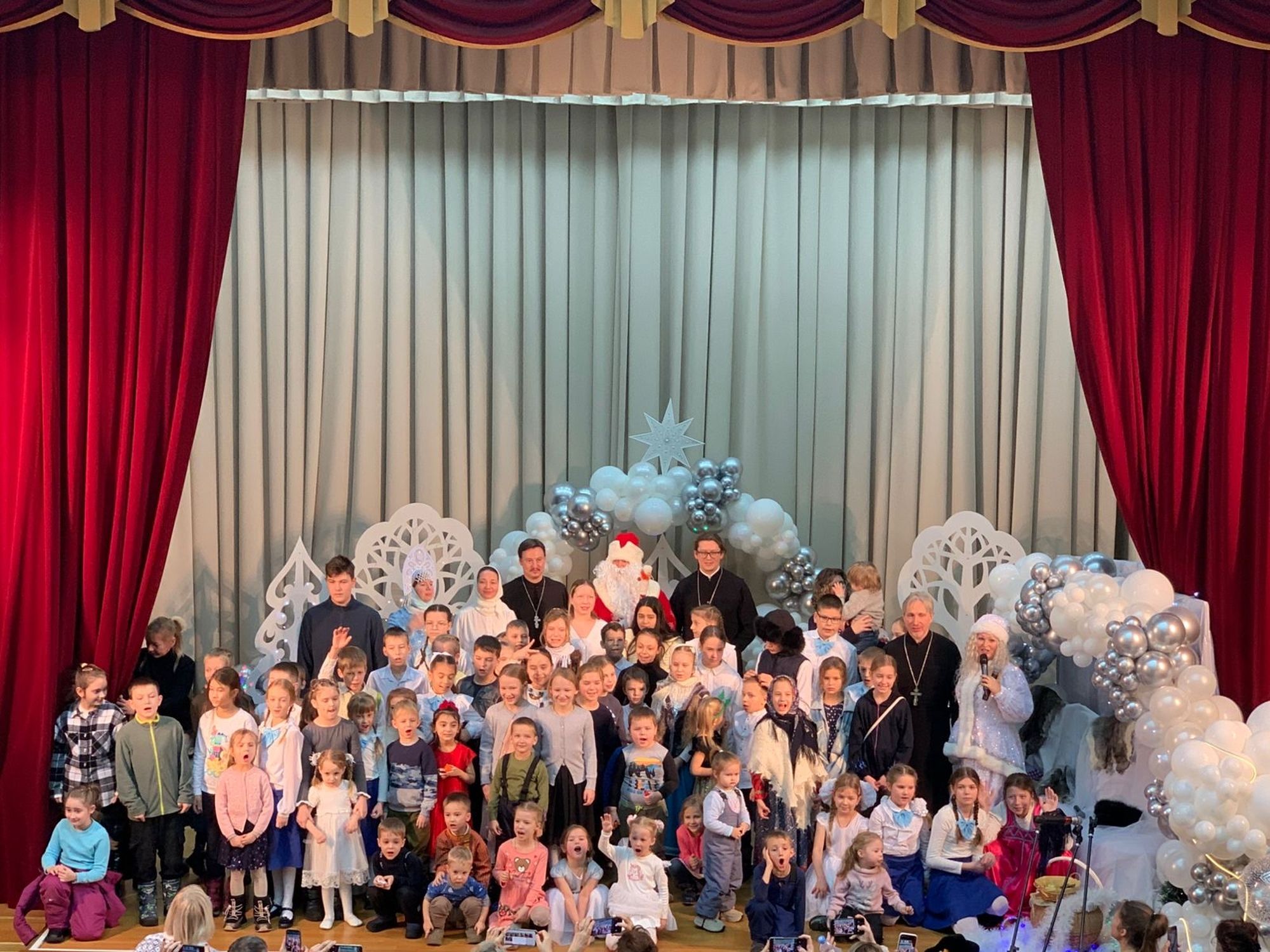 С песнями выступили дети из младшего и среднего хоров воскресной школы. Затем зрителей поздравил настоятель Неопалимовского храма священник Артемий Кравченко.