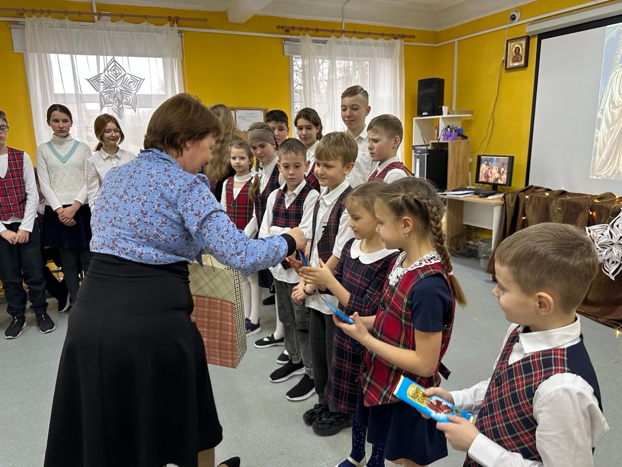 Отец Олег поздравил ребят с праздником Рождества Христова, Святого Богоявления и вручил сладкие подарки.