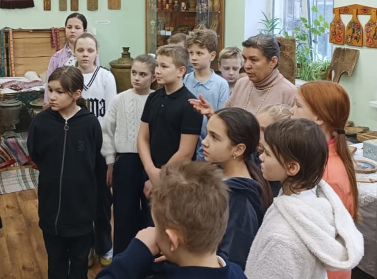 Галина Ивановна Машкова, руководитель мастерской узорного ткачества, и Татьяна Викторовна Лучкина, художник мастерской росписи по дереву, познакомили ребят с коллекциями приходского музея русского быта и народного творчества.