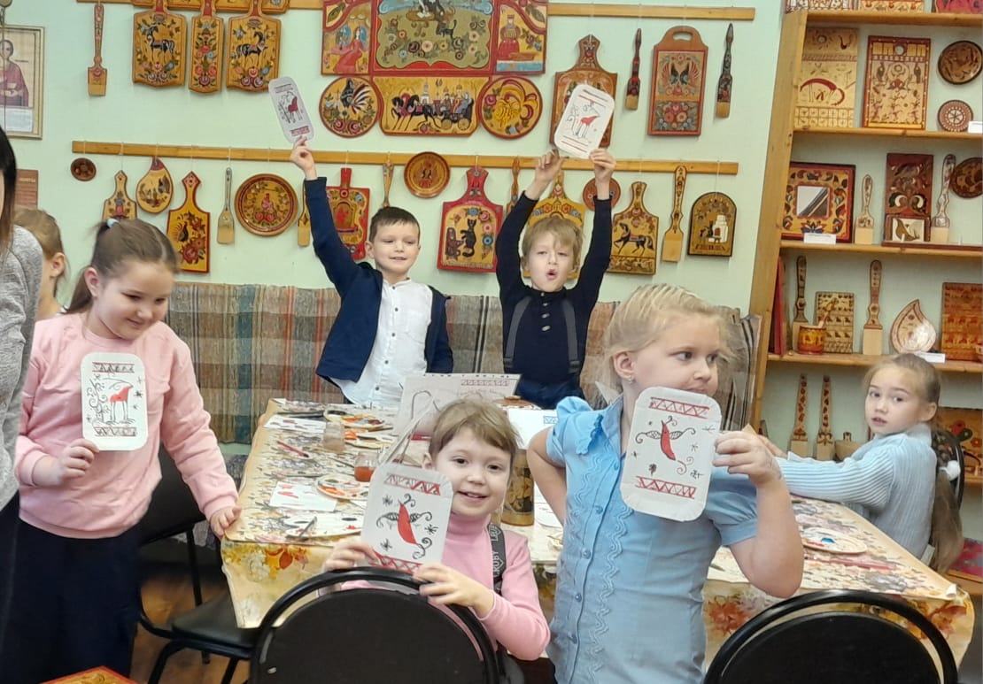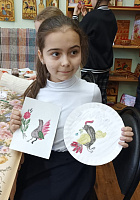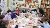В мастерской росписи по дереву первоклассники из школы №7 выполнили работу в стиле мезенской росписи, а ученики 4-го класса лицея N14 им. Громова своими руками расписали тарелку в стиле городецкой росписи.