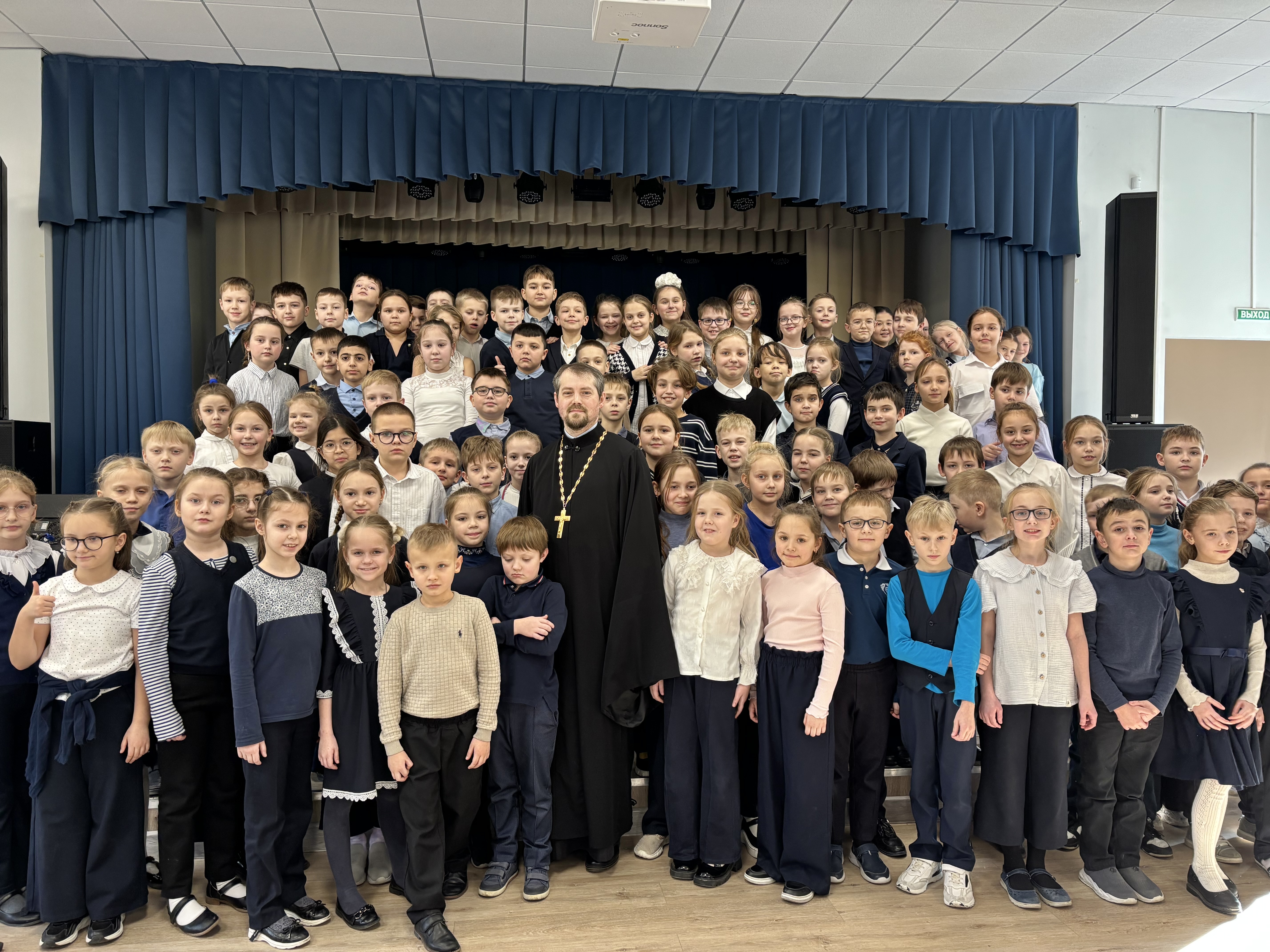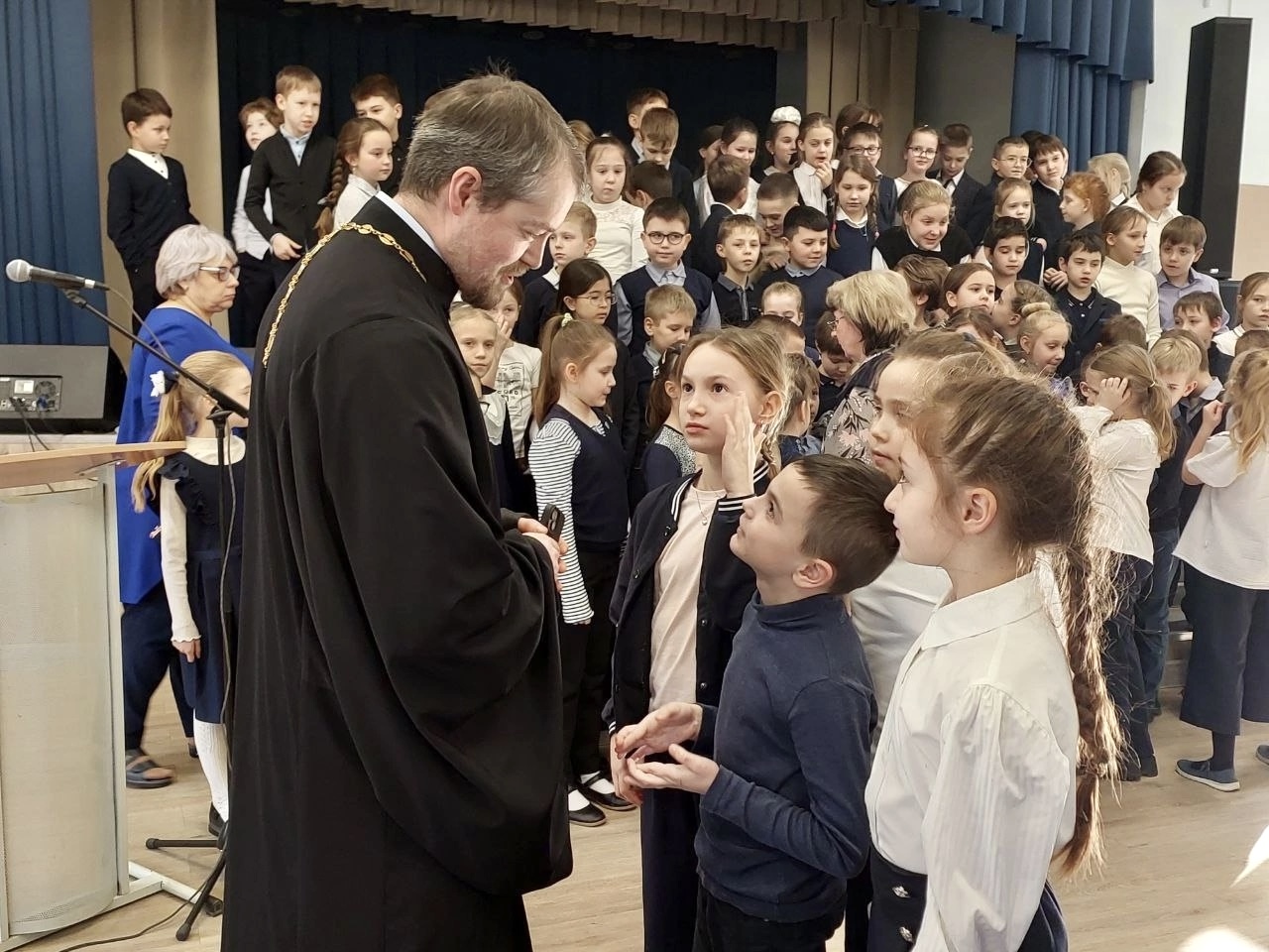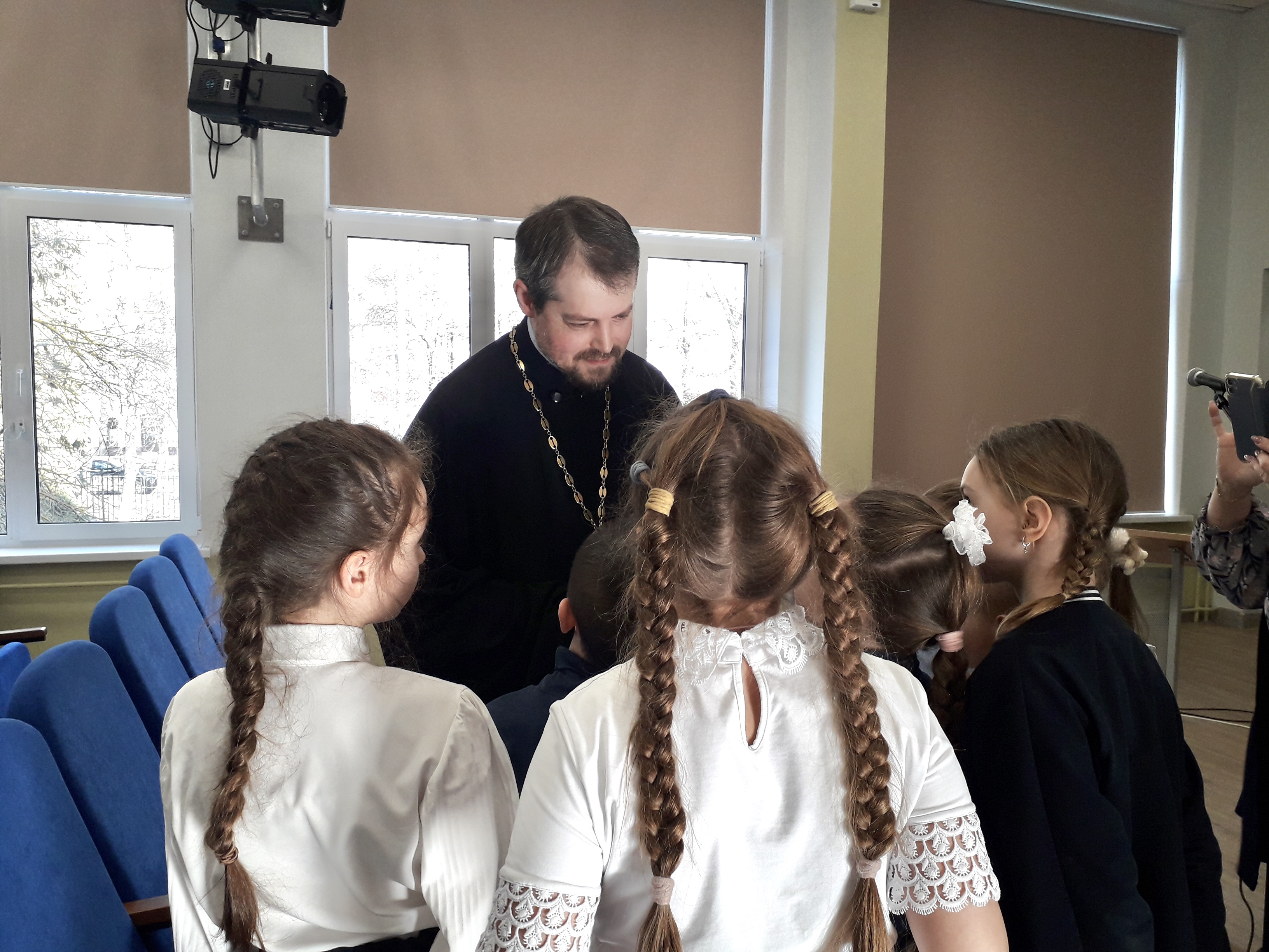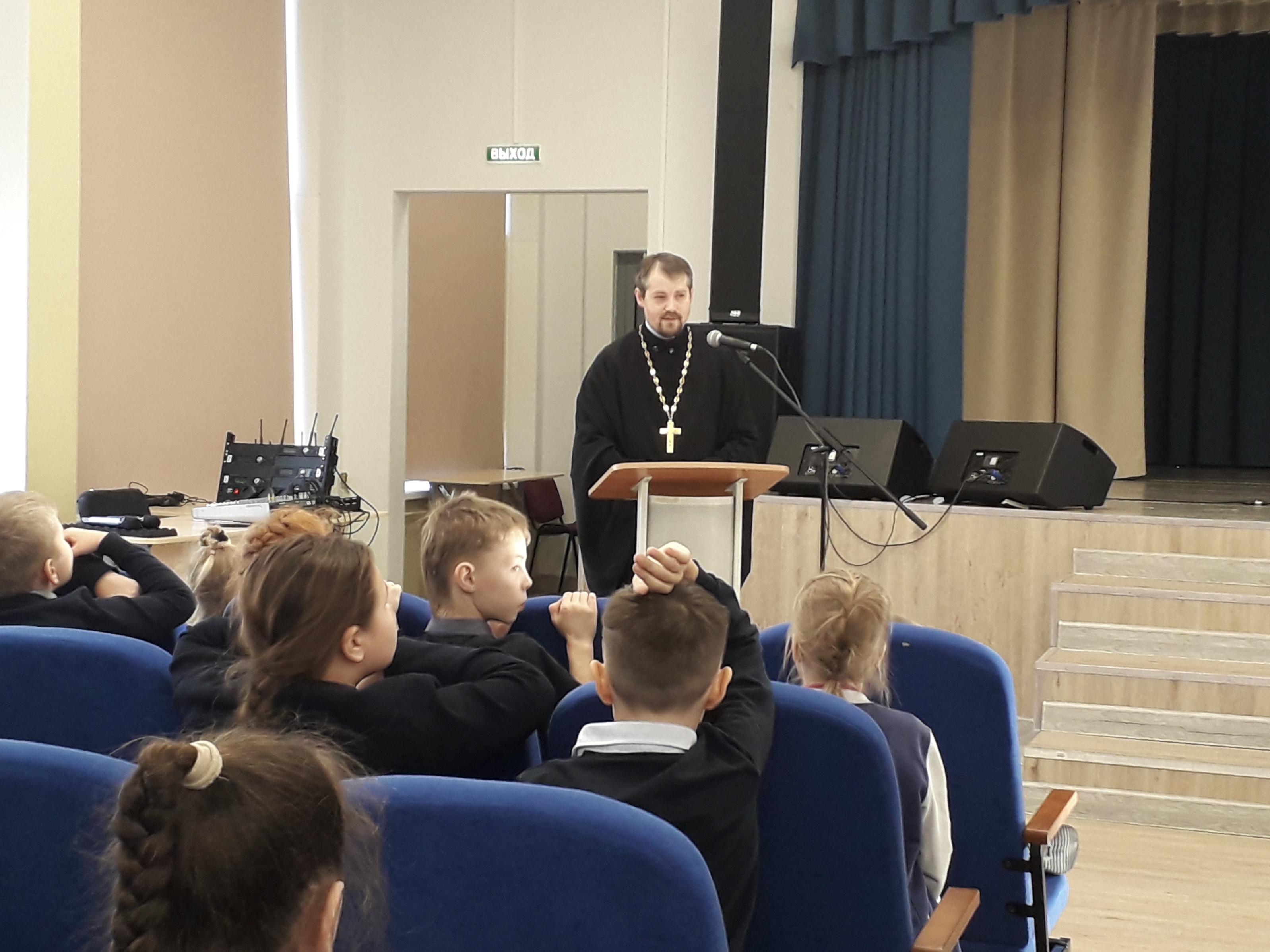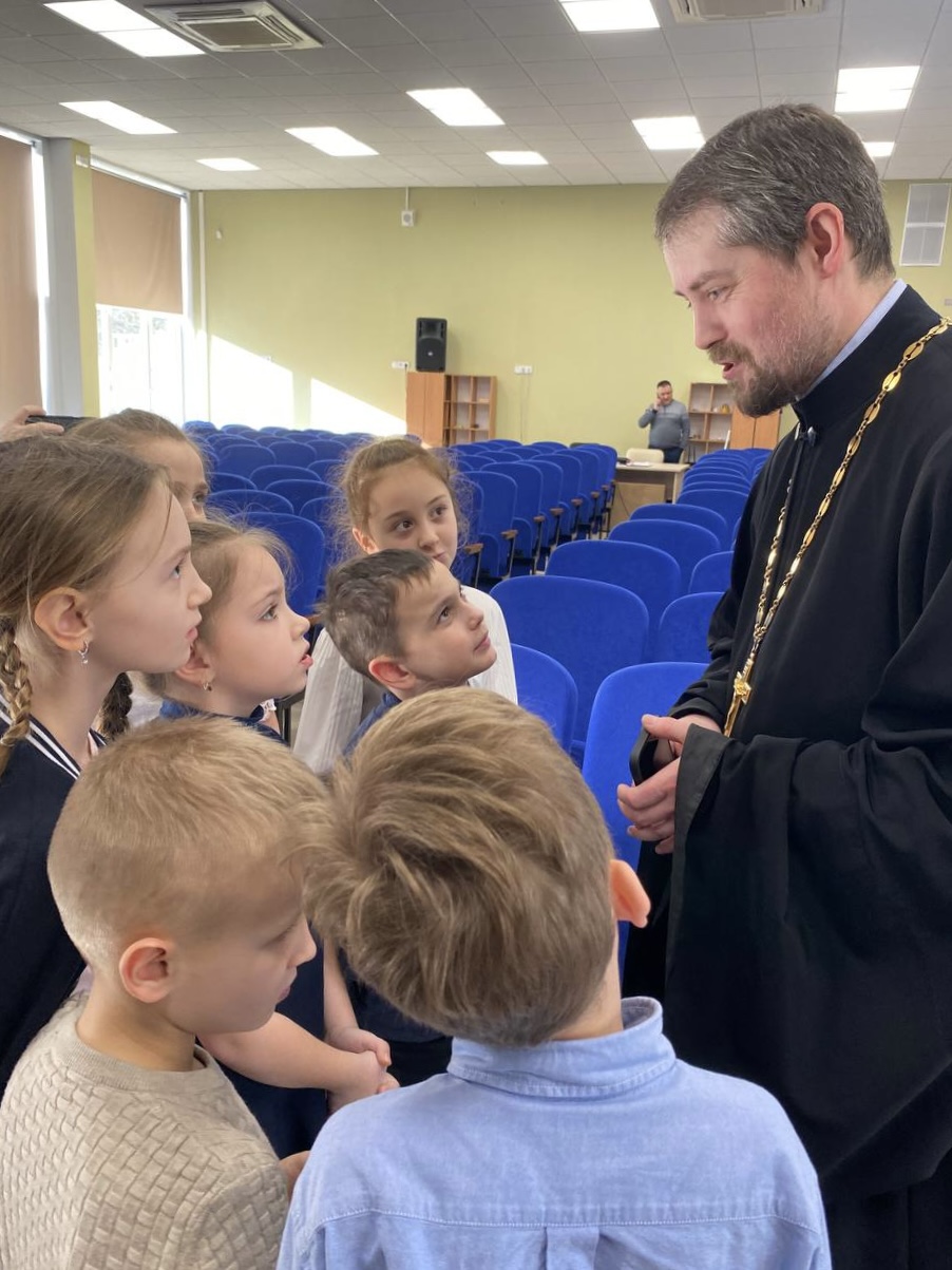 В актовом зале ответственный за религиозное образование в 1-м Воскресенском округе протоиерей Кирилл Седов встретился с обучающимися 3-х классов. Беседа была построена в форме живого диалога, где дети свободно задавали любые интересующие их вопросы. Школьники проявили живой интерес к теме семьи, взаимоотношений между людьми, внешнем виде священнослужителей, традиций религиозных праздников и многом-многом другом.