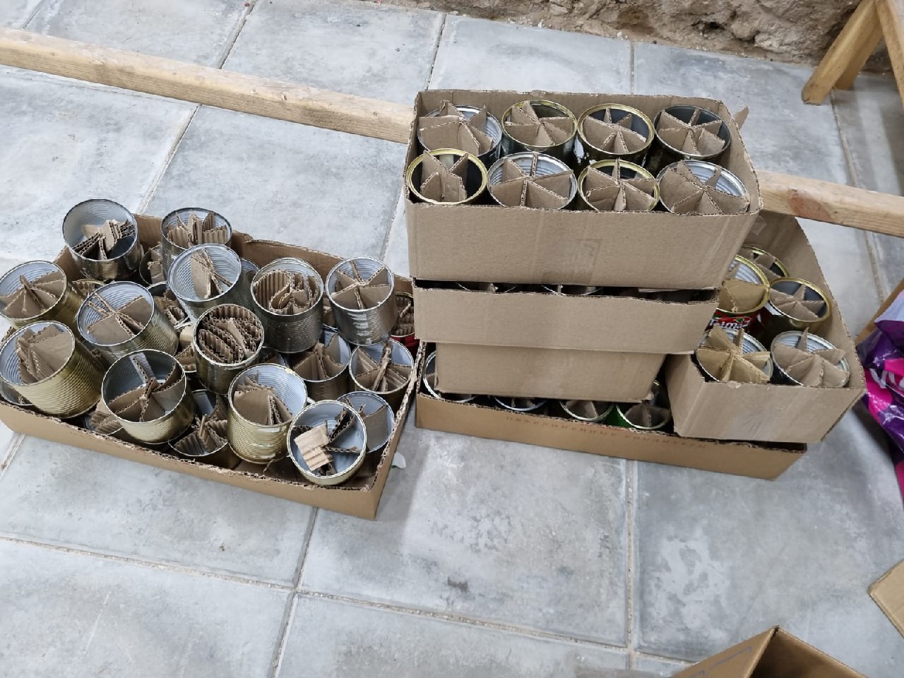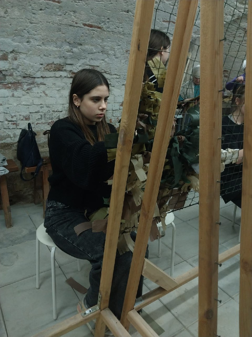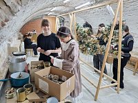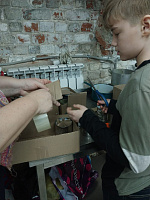 После этого представители молодежного объединения собора, прихожане храма и все желающие собрались в специально оборудованном помещении в подклете Иерусалимского храма, чтобы подготовить партию окопных свечей к заливке парафином и в дружной атмосфере доплести маскировочную сеть.