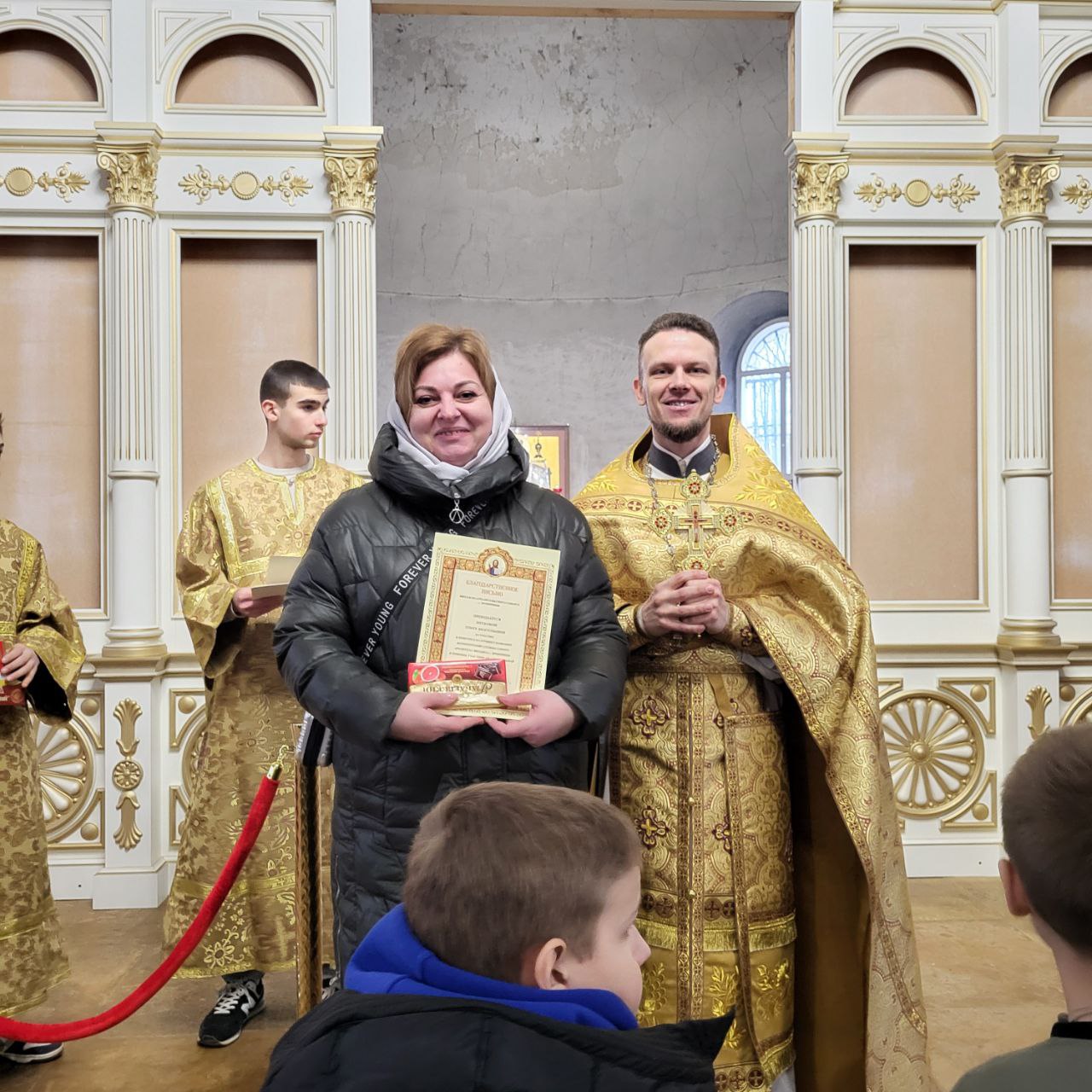 В этот день по окончании Литургии в Иерусалимском храме г. Бронницы соборного комплекса настоятель прихода, благочинный 1-го Бронницкого округа иерей Сергий Себелев вручил благодарственные письма прихожанам, принявшим участие в конкурсе на лучшее название этой волонтерской службы.