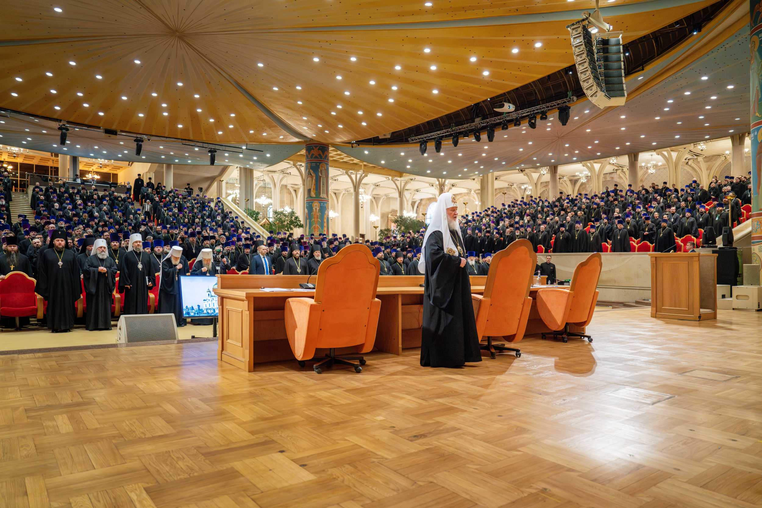 Открывая заседание, Предстоятель Русской Православной Церкви приветствовал собравшихся. Заместителем председателя собрания был избран митрополит Крутицкий и Коломенский Павел, секретарем — архиепископ Подольский и Люберецкий Аксий. Святейший Патриарх Кирилл пригласил митрополита Павла и архиепископа Аксия занять места в президиуме собрания. Далее Святейший Владыка огласил повестку дня.