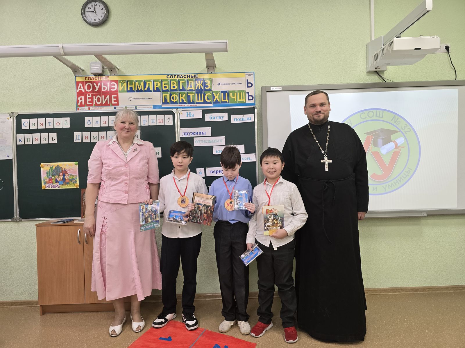 12 февраля в корпусе №2 школы №32 г. Подольск, в рамках школьной интеллектуальной игры «Умники и умницы», для учеников 4 класса была проведена игра на тему святого благоверного князя Димитрия Донского. Ребята показали свои глубокие знания эпохи княжения святого князя, исторического контекста и персоналий, связанных с его судьбой. Для участия в жюри на игру был приглашен настоятель Никольского храма г. Подольск иерей Алексий Суриков, который также задал ребятам дополнительные вопросы на заданную тему.