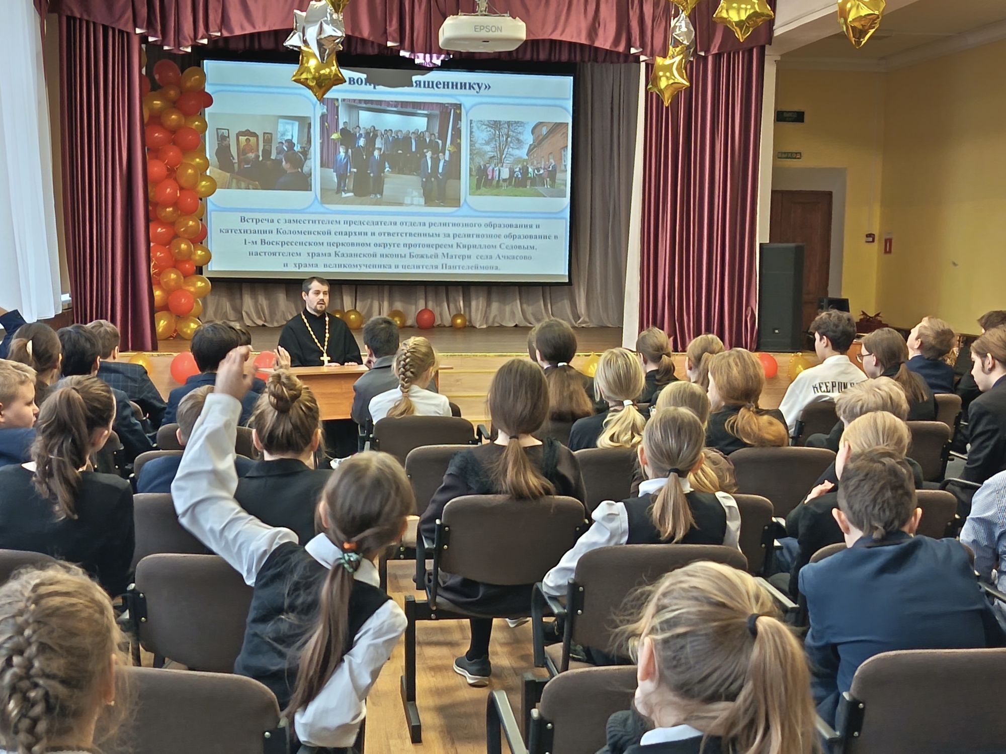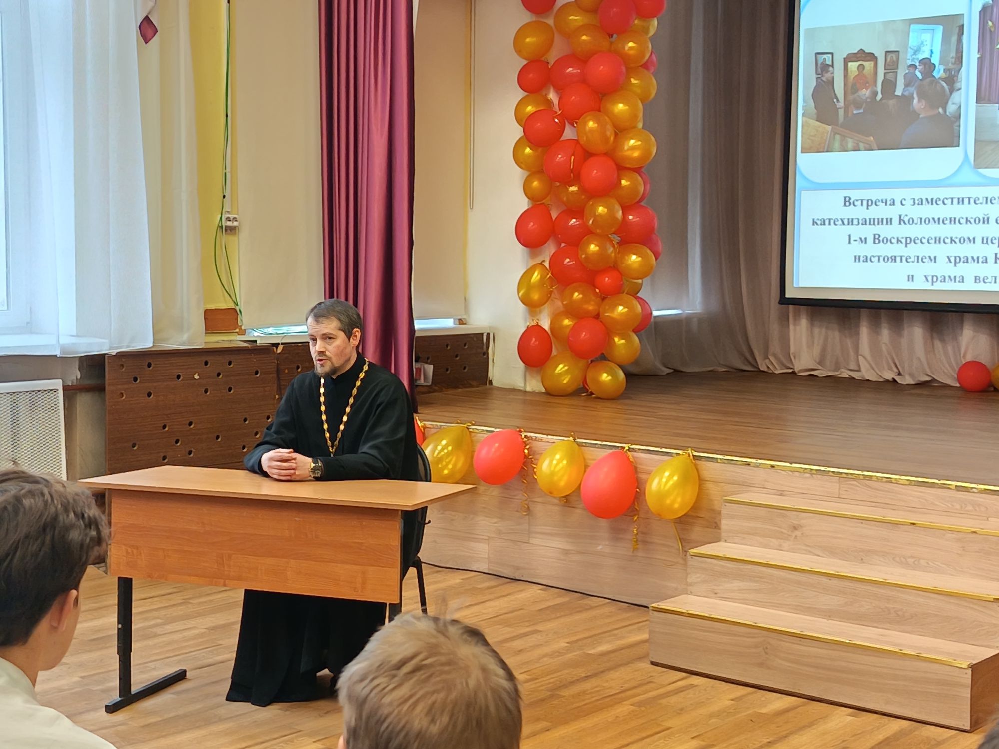 12 февраля 2025 года заместитель председателя Отдела религиозного образования и катехизации Коломенской епархии и ответственный за религиозное образование в 1-м Воскресенском церковном округе протоиерей Кирилл Седов по приглашению администрации посетил МОУ «Лицей № 6», где в рамках проекта «Задай вопрос священнику» встретился с обучающимся 4-8 классов.