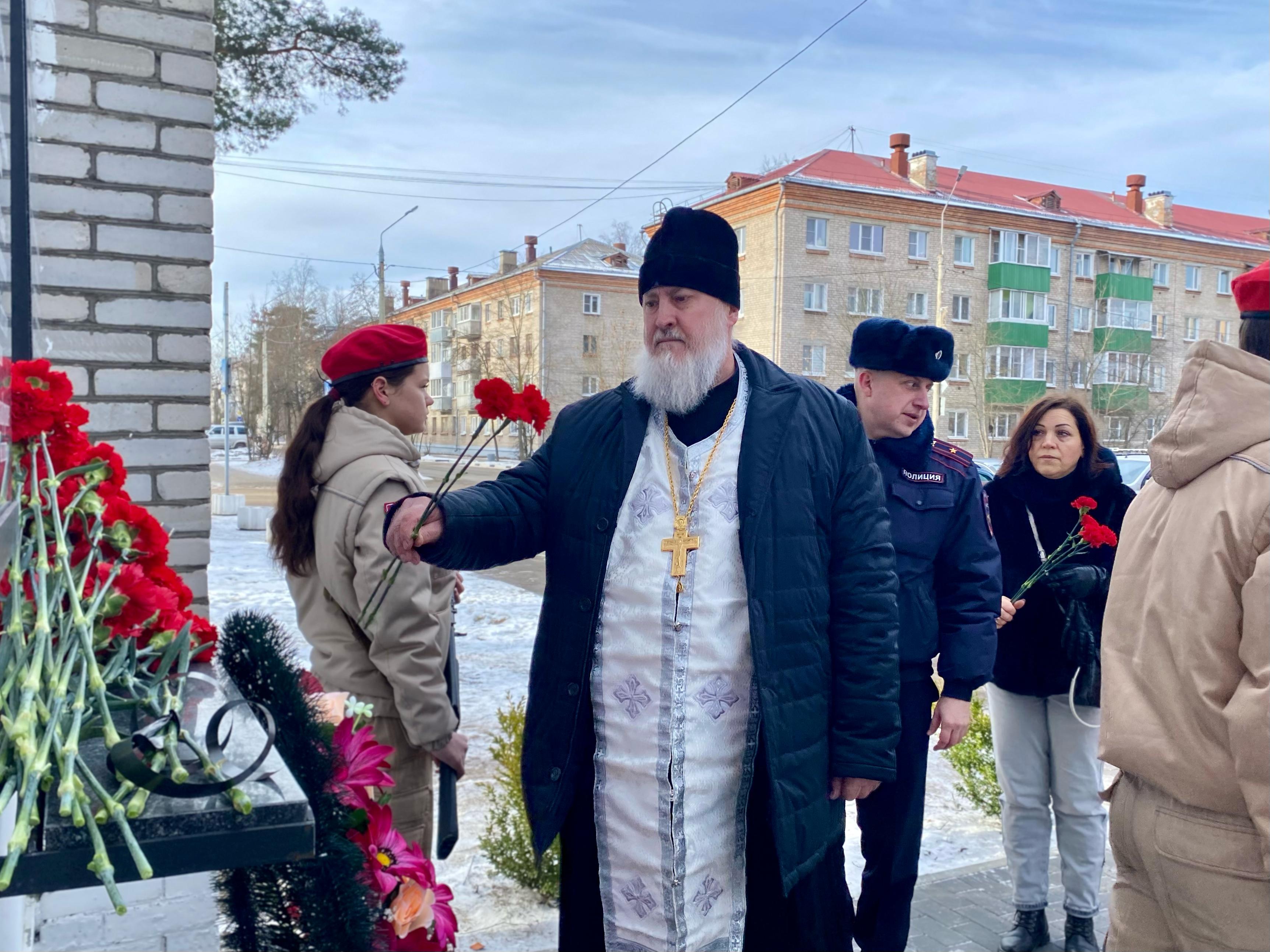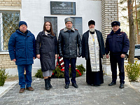 После служения панихиды отец Евгений обратился к участникам патриотического мероприятия со словом проповеди, после чего у мемориалы были возложены цветы и памятный венок.