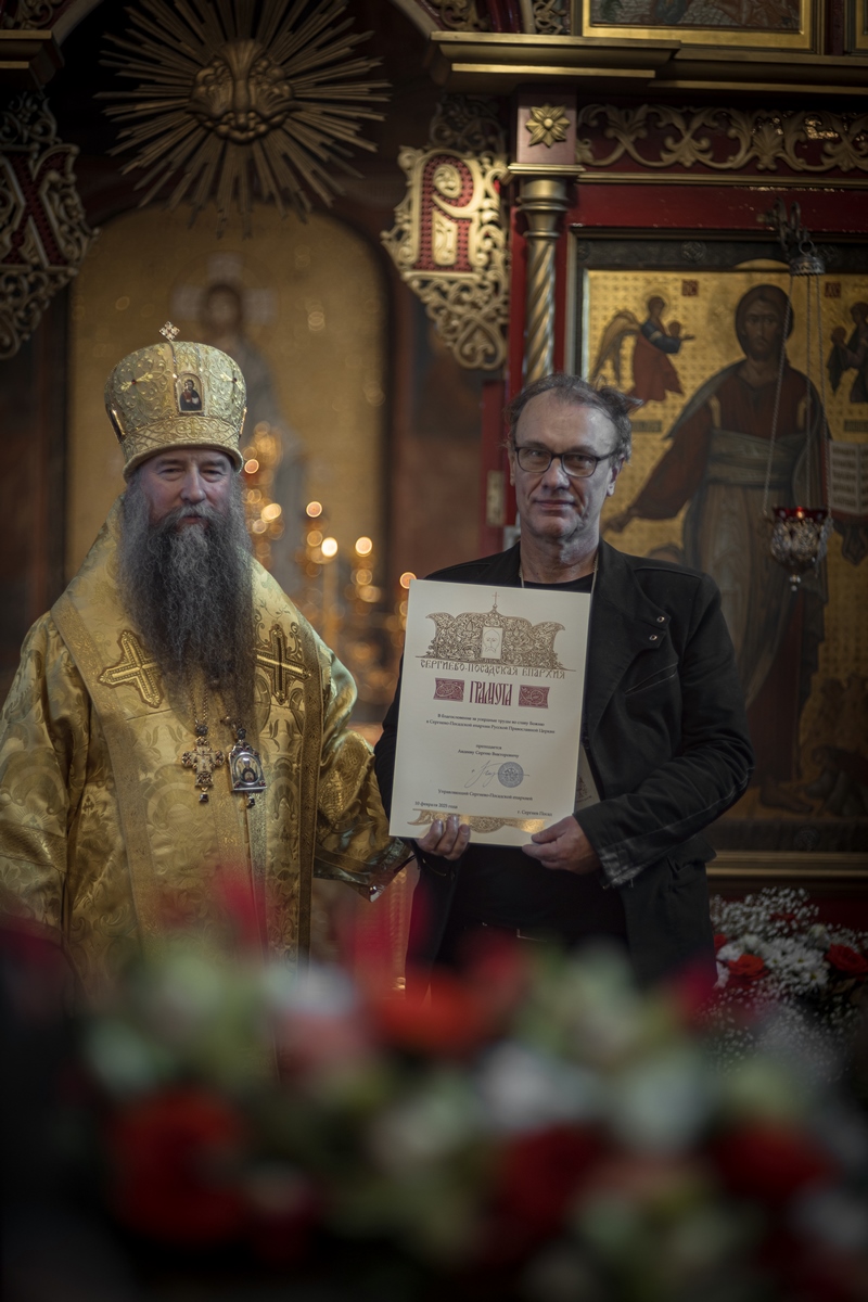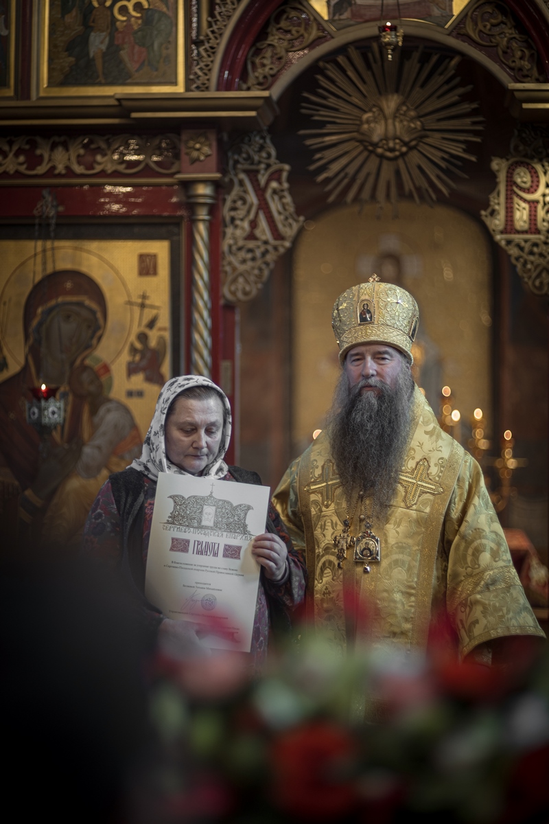 Владыка поздравил собравшихся с престольным праздником, обратился с напутственным словом и вручил епархиальные награды. Епархиальной медали священномученика Серафима (Звездинского), епископа Дмитровского, удостоены староста Никольского храма Сергей Бульчук и благотворитель храма Галина Петрова. Епархиальной грамоты удостоены звонарь храма Сергей Авдеев и сотрудник храма Татьяна Беляева.