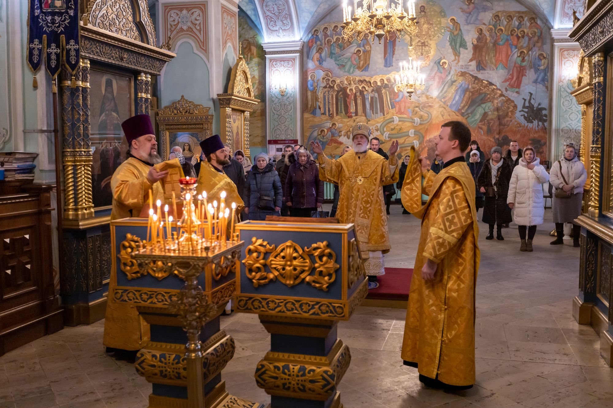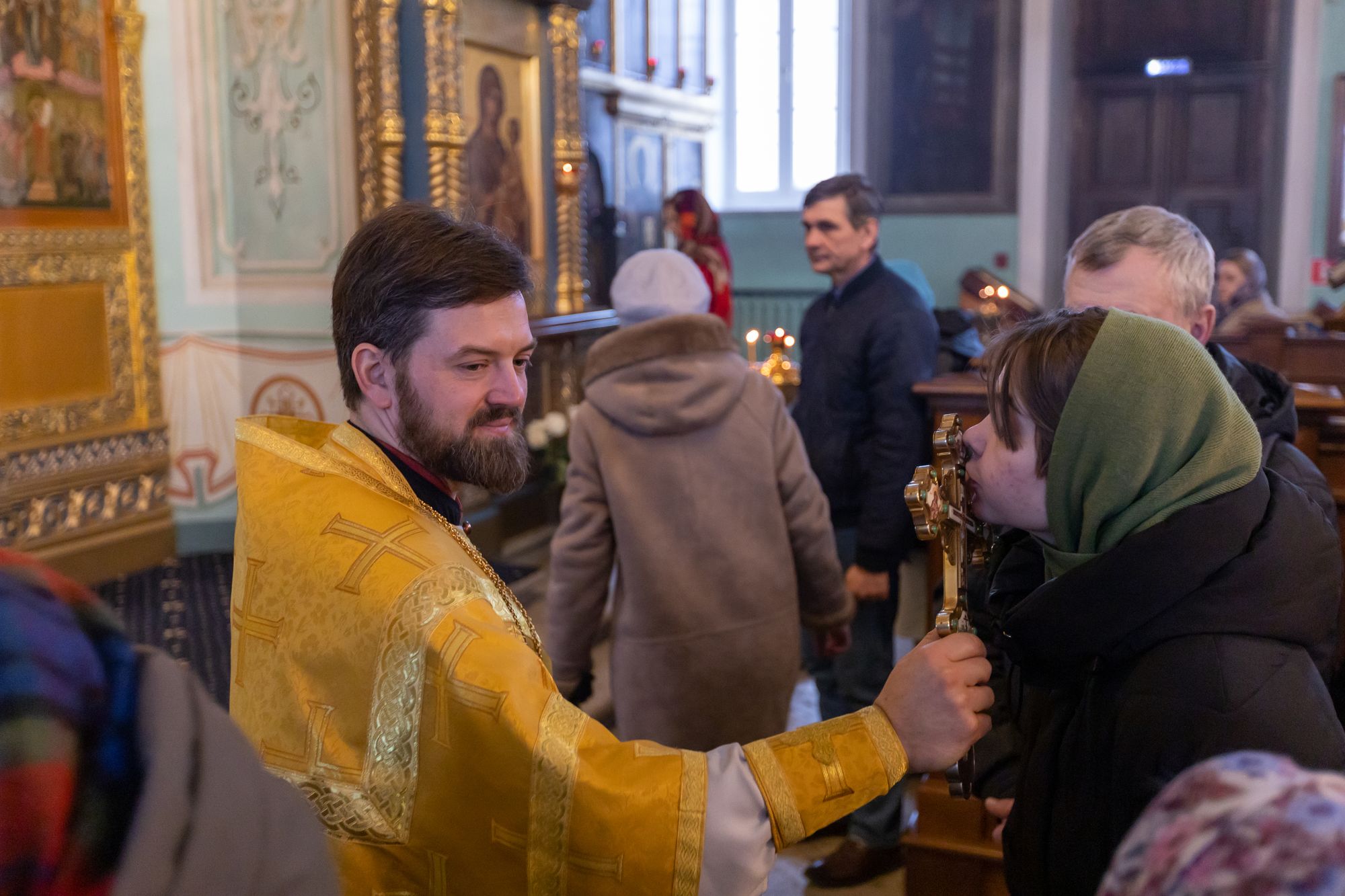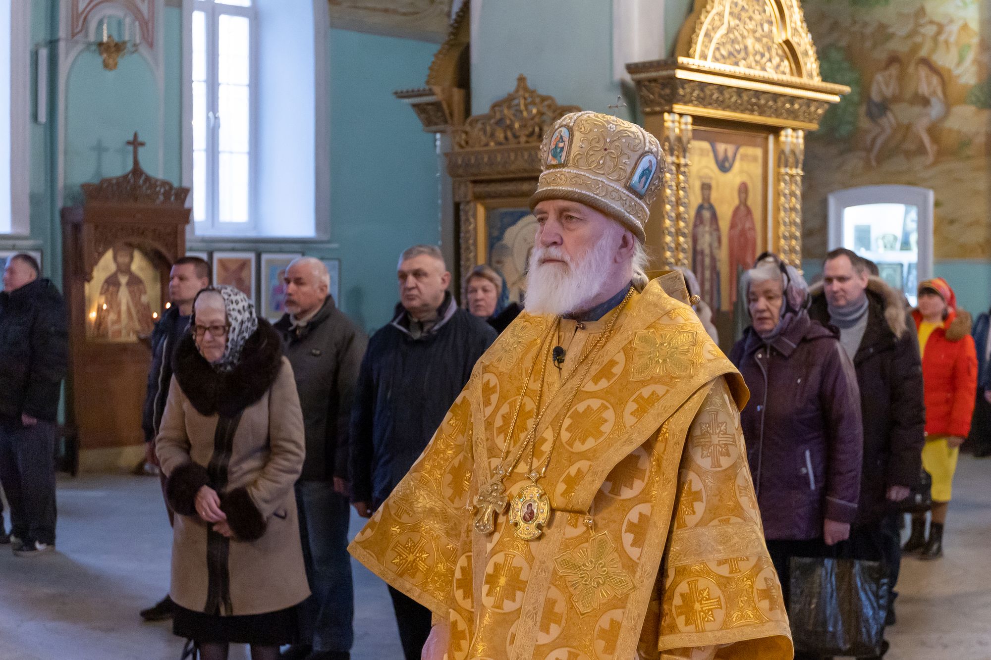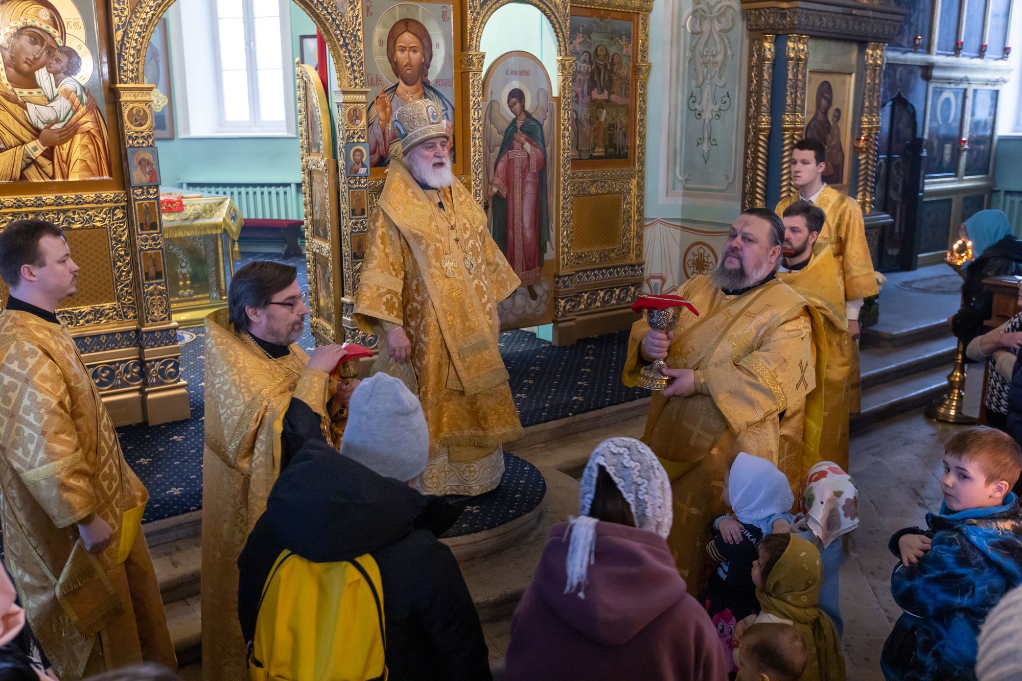 2 марта 2025 года, в Неделю сыропустную, воспоминание Адамова изгнания, прощёное воскресенье и память священномученика Ермогена, патриарха Московского и всея Руси, чудотворца, митрополит Крутицкий и Коломенский Павел возглавил Божественную литургию в Тихвинском храме Успенского кафедрального собора города Коломны.