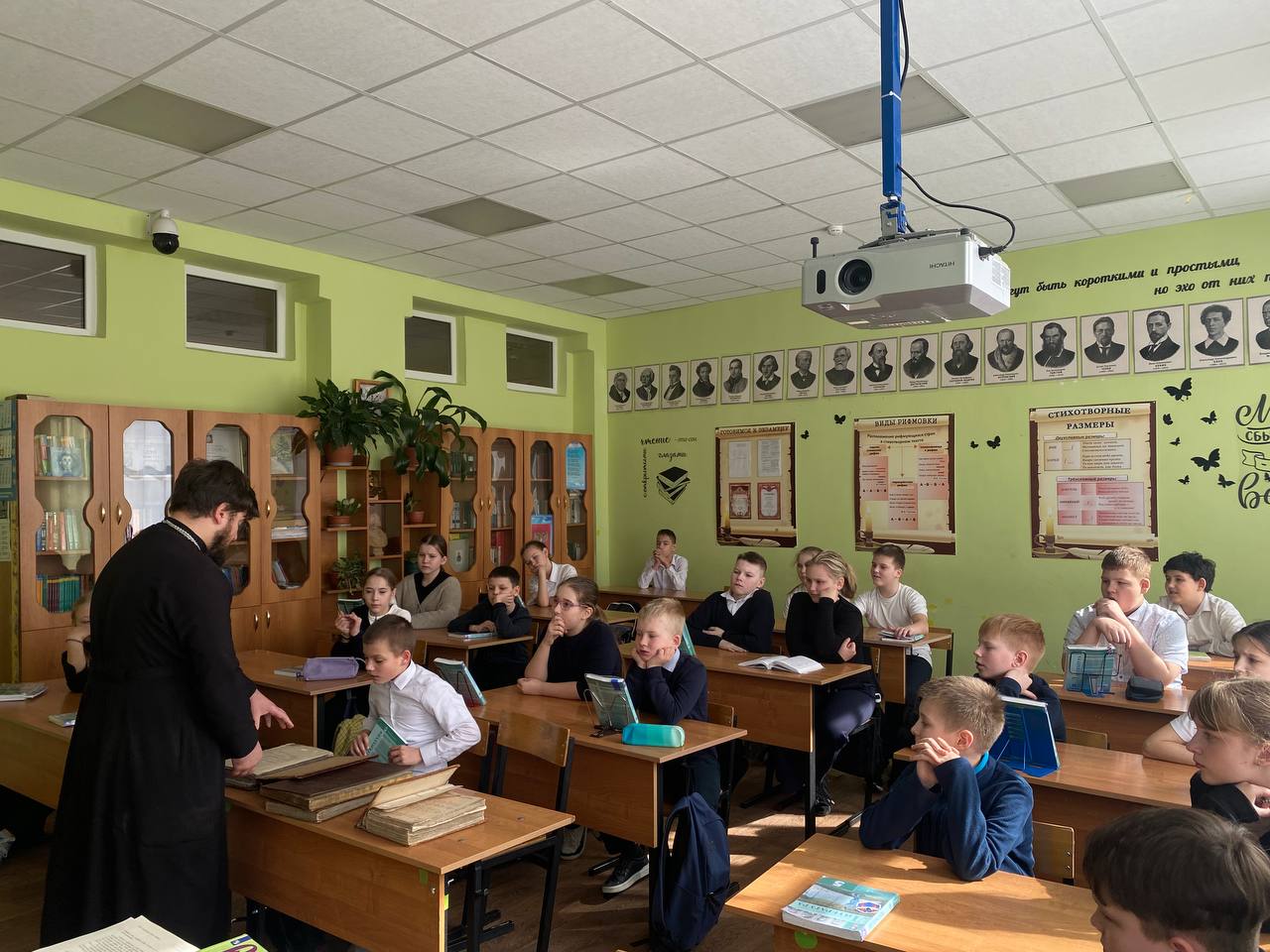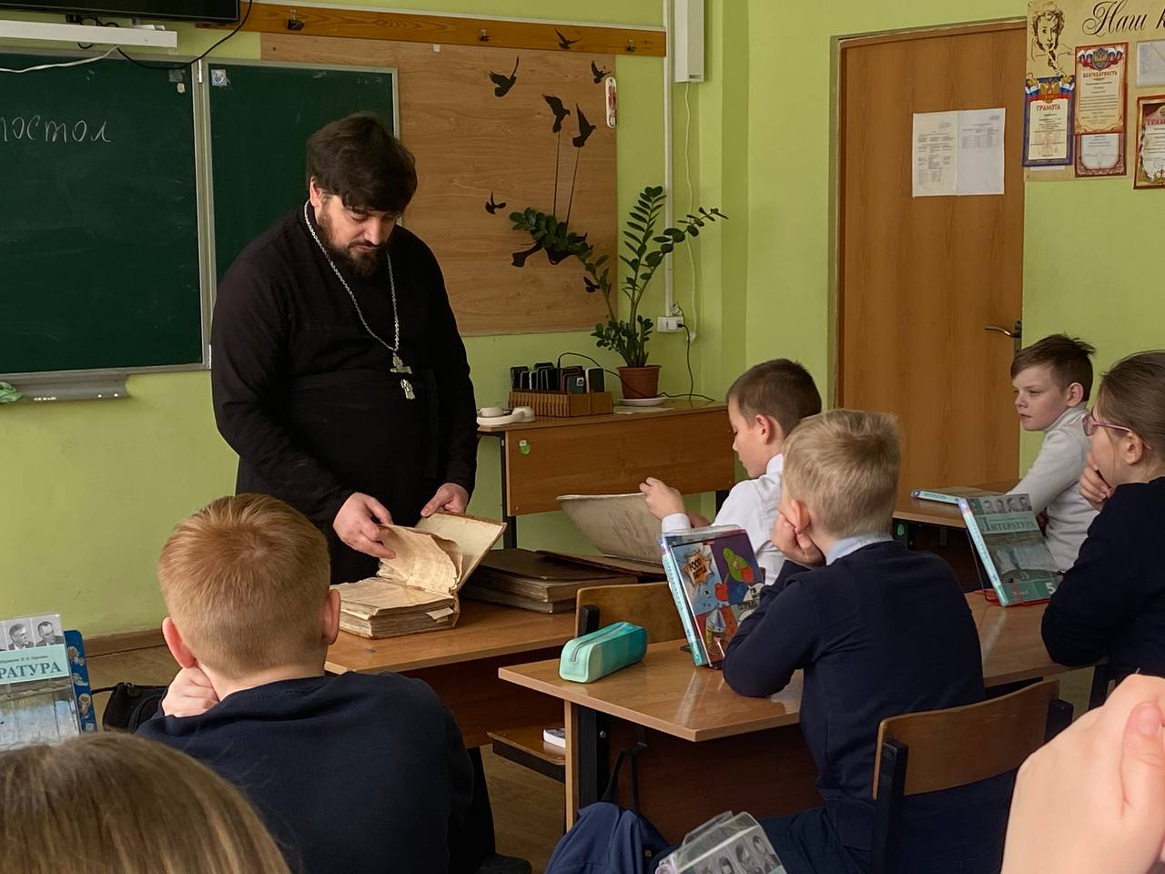21 марта, в рамках Дня Православной книги, настоятель Богородицерождественского храма с. Раменки священник Георгий Курдогло встретился с учащимися 5 и 6 классов гимназии №10. В ходе занятий ребята осознали важность чтения, ознакомились с дореволюционными печатными изданиями и поразмышляли над смыслом Великого поста.