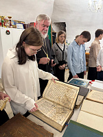 12 марта, согласно плану духовно-нравственного воспитания и в рамках сотрудничества Гимназии им. А.А. Пушкина г. Бронницы и 1-го Бронницкого благочиния, обучающиеся 7-х классов посетили собор Михаила Архангела. Беседу с гостями о возникновении письменности и первых рукописных книгах провел ответственный по работе с молодежью в 1-м Бронницком благочинии иерей Даниил Ганьшин. Ребята с увлечением слушали и даже пробовали читать тексты на церкрвнославянском языке, листали страницы хранящихся в соборе метрических книг XIX столетия. Потом за чашкой чая отец Даниил ответил на вопросы гостей.