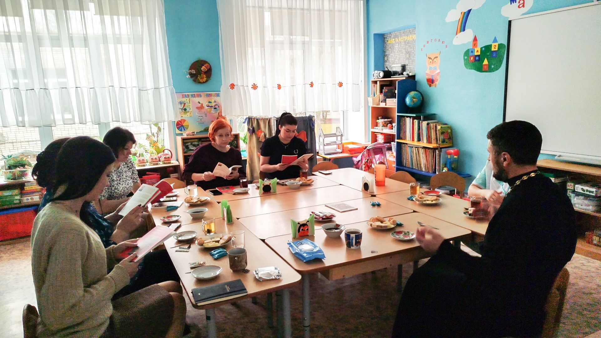 28 марта, в рамках долгосрочного проекта «100 вопросов батюшке», настоятель храма иконы Божией Матери «Спорительница хлебов» города Щёлково священник Александр Мороков встретился с заведующей и воспитателями детского сада «Радость» города Щёлково, провёл с ними духовную беседу и ответил на вопросы.