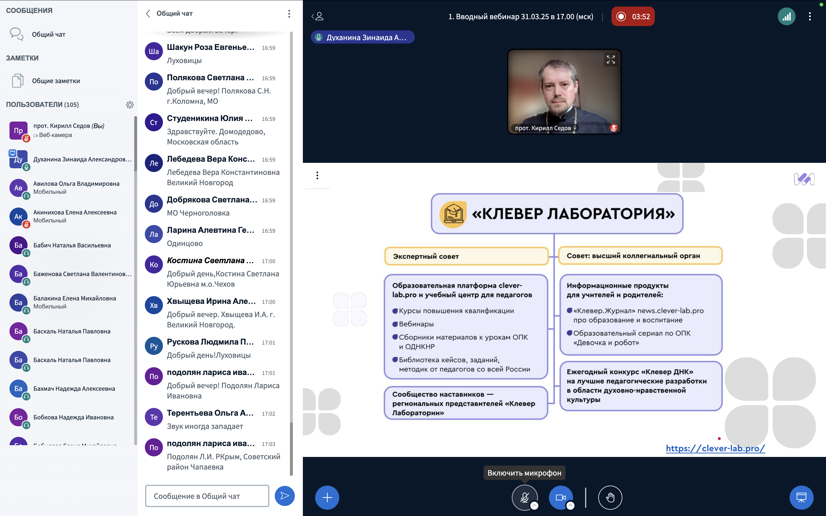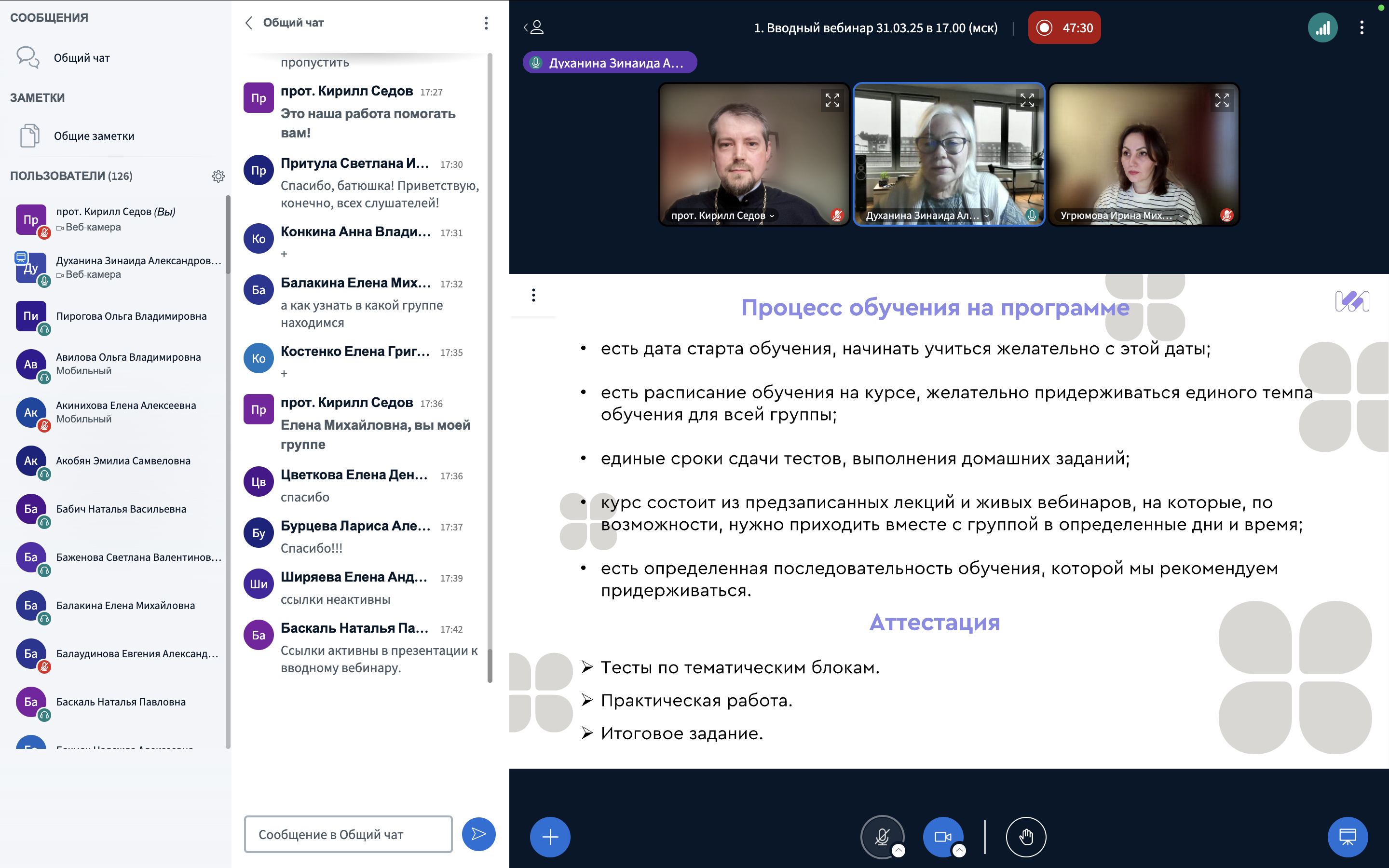 Установочный вебинар провели руководитель программы кураторов З.А. Духанина и заместитель председателя Отдела религиозного образования и катехизации Коломенской епархии, старший куратор курса протоиерей Кирилл Седов. К слушателям также обратились методист отдела религиозного образования и катехизации Нижнетагильской епархии Н.А. Рассохина, заместитель директора ЧОУ «Воронежская православная гимназия во имя святителя Митрофана Воронежского» Е.С. Волокитина и заместитель директора по учебно-воспитательной работе ГБОУ ЛНР «Фабричненская СШ» Е.В. Мальцева.