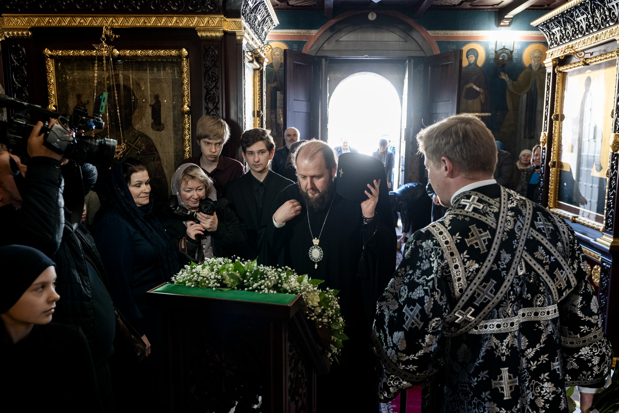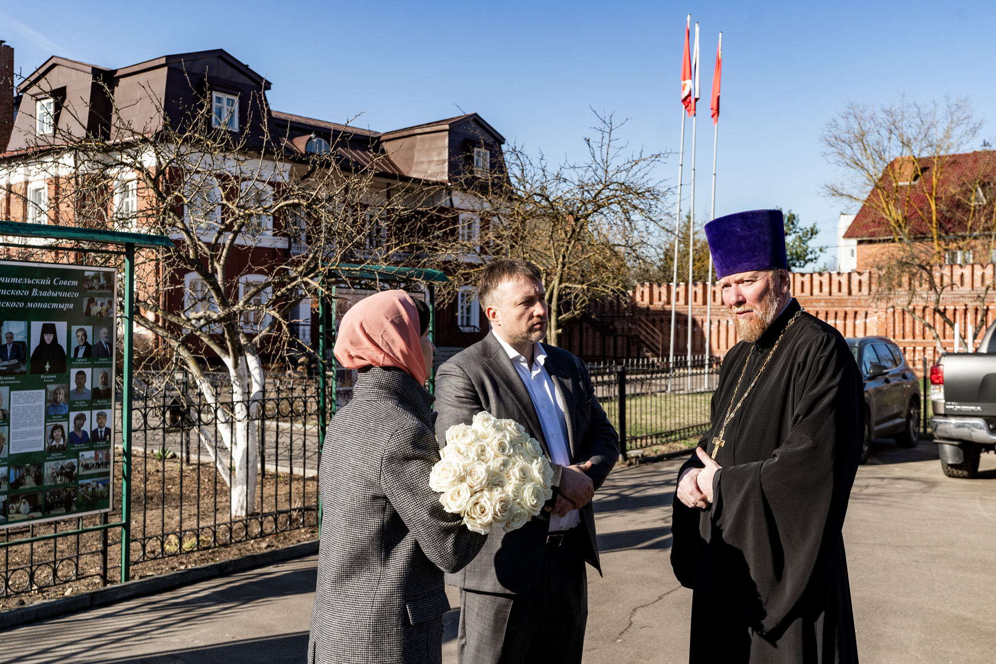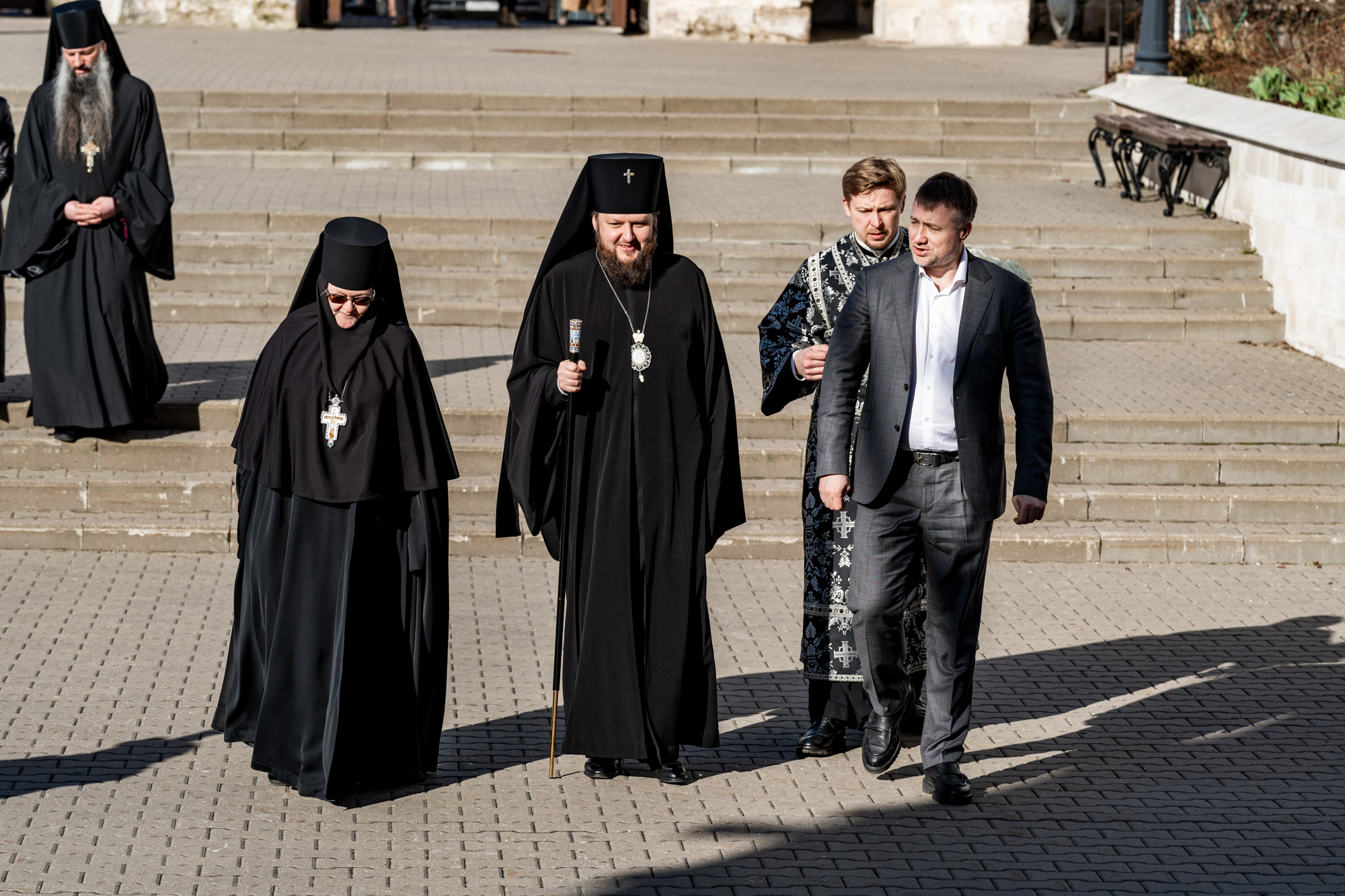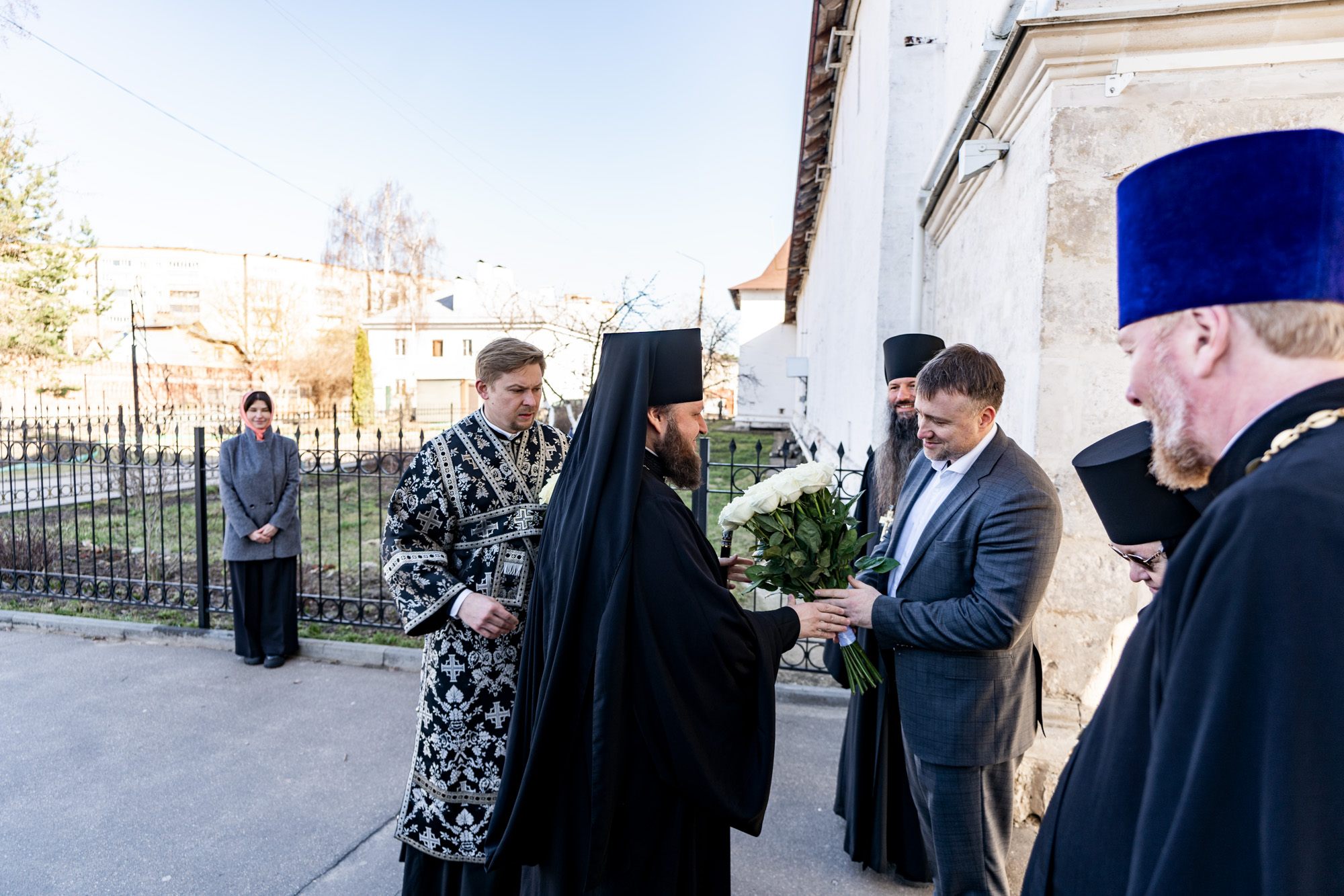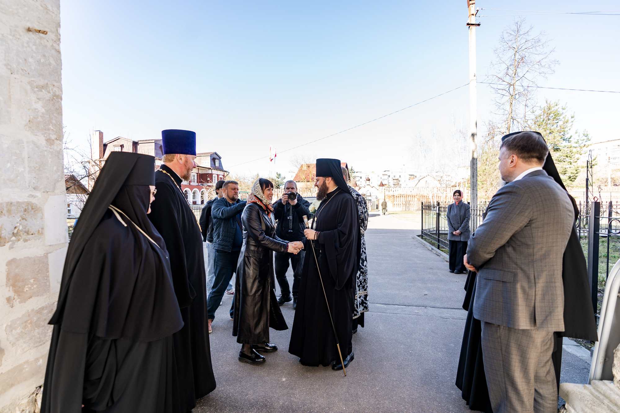 У ворот обители владыку встречали временно исполняющий полномочия главы г.о. Серпухов А.В. Шимко, благочинный монастырей Подольской епархии, игумен Вознесенской Давидовой пустыни Сергий (Куксов), благочинный Серпуховского церковного округа иерей Дионисий Коськин и игумения монастыря Алексия (Петрова).