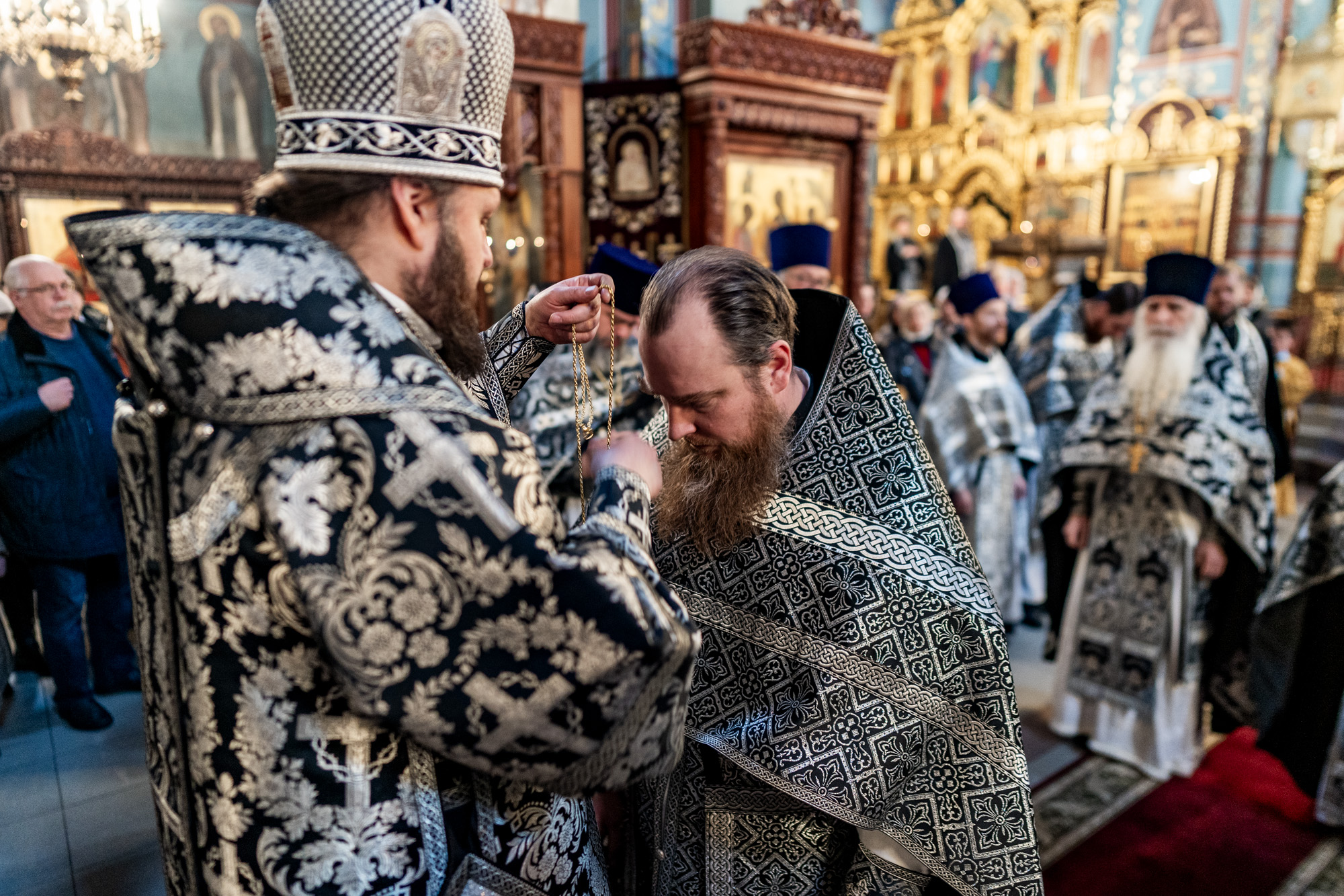 После малого входа владыка совершил награждение клириков Домодедовского благочиния богослужебно-иерархическими наградами ко дню Святой Пасхи за усердное служение Церкви.