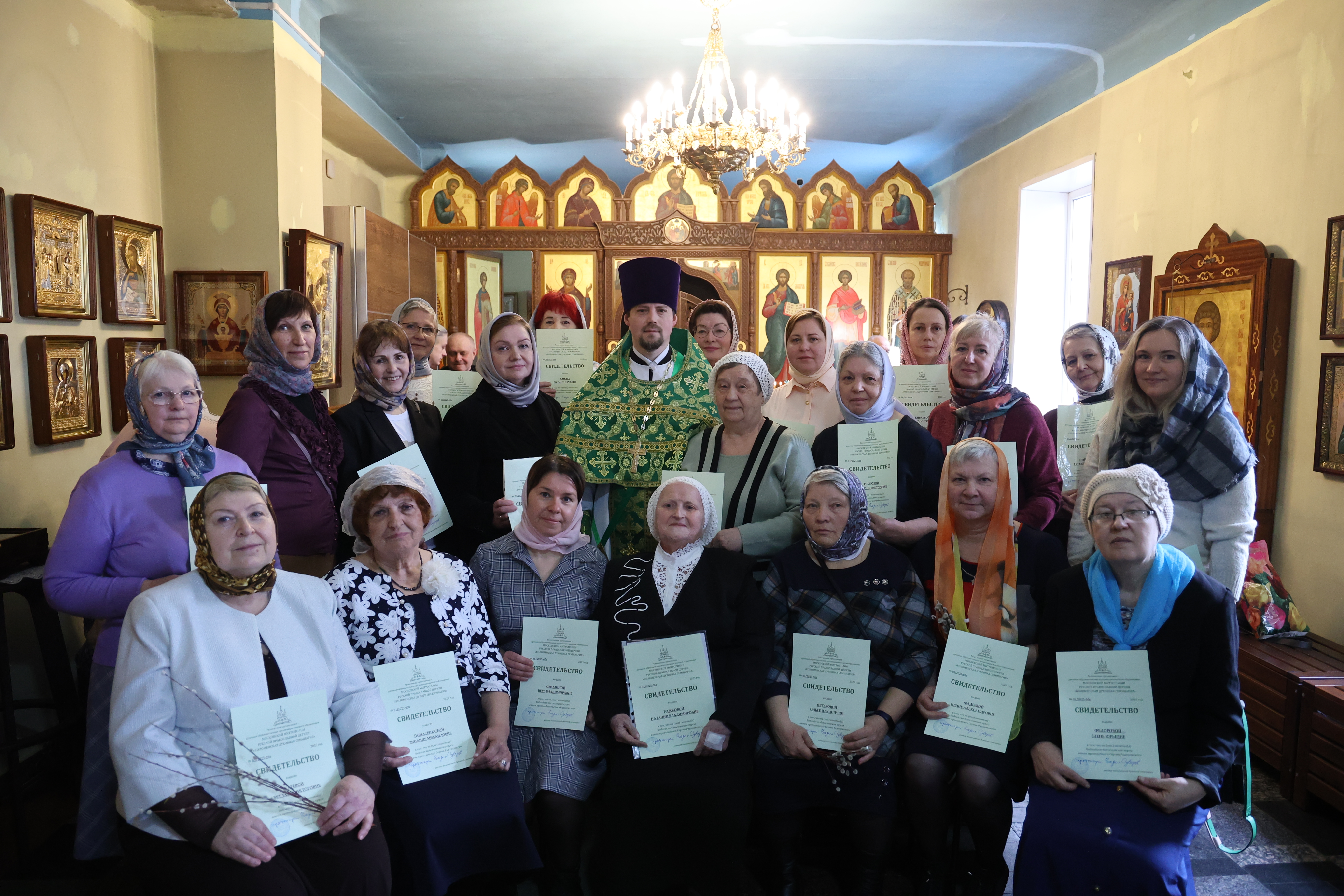 13 апреля 2025 года, в праздник Входа Господня в Иерусалим, в Иерусалимском и Пантелеимоновском храмах г. Воскресенска состоялось торжественное вручение свидетельств выпускникам епархиальных Библейско-Богословских курсов имени преподобного Сергия Радонежского (Воскресенское отделение №1, № 2).