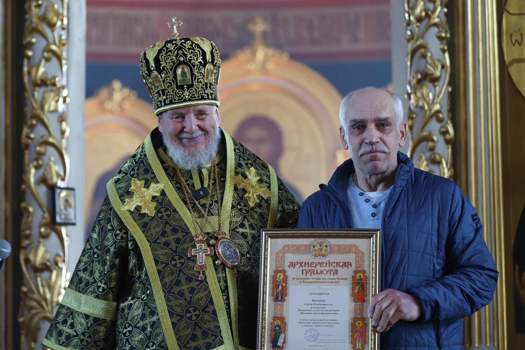 Затем во внимание к усердным трудам на благо Святой Церкви владыка Николай вручил медаль Балашихинской епархии священномученика Константина Богородского протоиерею Марку Ермолаеву. Архиерейской грамоты за усердные труды был удостоен руководитель Московского клуба коллекционеров «Истинные друзья фалеристики» Сергей Владимирович Бычков. От клуба коллекционеров Сергей Владимирович вручил протоиерею Марку Ермолаеву орденский знак «Защитнику веры православной».