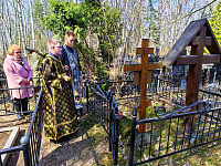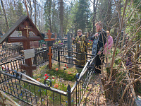 16 апреля клирик Преображенского храма микрорайона Саввино города Балашихи священник Максим Бойко совершил Заупокойную литию на месте недавно обнаруженного захоронения на Пуршевском кладбище городского округа Балашиха заштатного клирика Московской епархии протоиерея Леонида Бухарова (1927-1984).