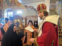 После шестой песни канона Владыка вручил настоятельнице монастыря, игумении Амвросии (Гавриневой) награду — наперсный крест с украшениями.