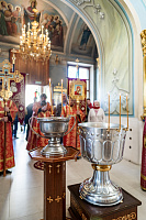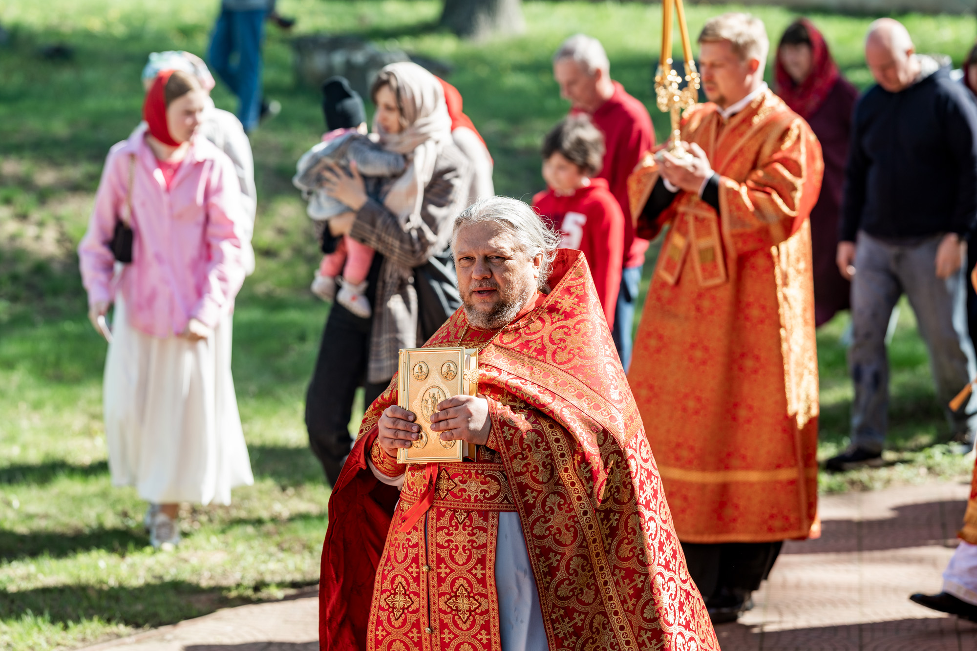 Далее было совершено освящение воды перед иконой Божией Матери «Живоносный Источник» и прошёл крестный ход вокруг храма. Затем на святом источнике преподобного Давида Серпуховского был совершён чин освящения воды.
